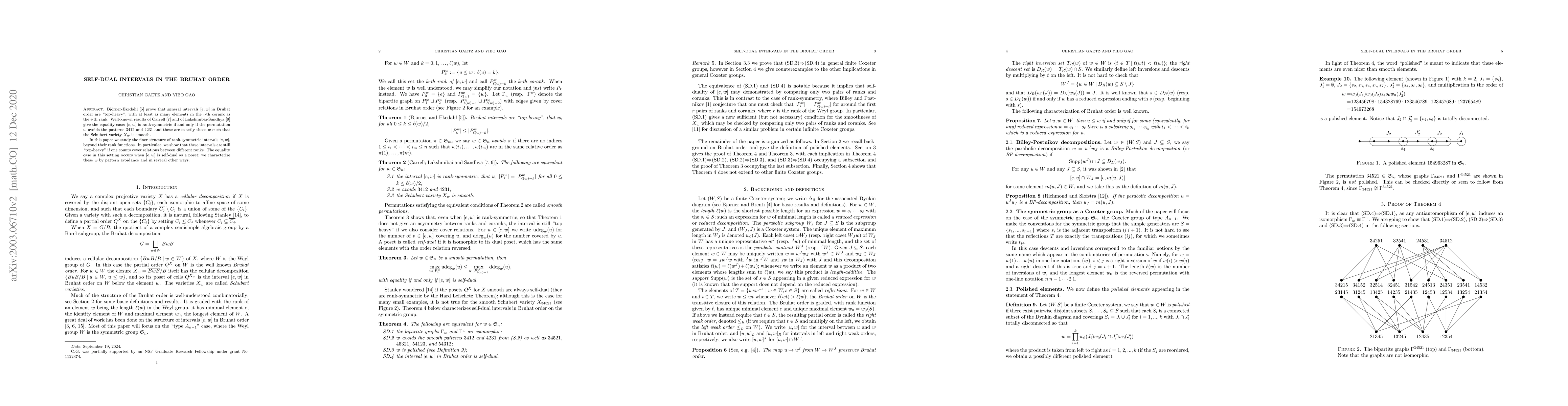 Bj\"orner-Ekedahl prove that general intervals $[e,w]$ in Bruhat order are "top-heavy", with at least as many elements in the $i$-th corank as the $i$-th rank. Well-known results of Carrell and of Lakshmibai-Sandhya give the equality case: $[e,w]$ is rank-symmetric if and only if the permutation $w$ avoids the patterns $3412$ and $4231$ and these are exactly those $w$ such that the Schubert variety $X_w$ is smooth. In this paper we study the finer structure of rank-symmetric intervals $[e,w]$, beyond their rank functions. In particular, we show that these intervals are still "top-heavy" if one counts cover relations between different ranks. The equality case in this setting occurs when $[e,w]$ is self-dual as a poset; we characterize these $w$ by pattern avoidance and in several other ways.
