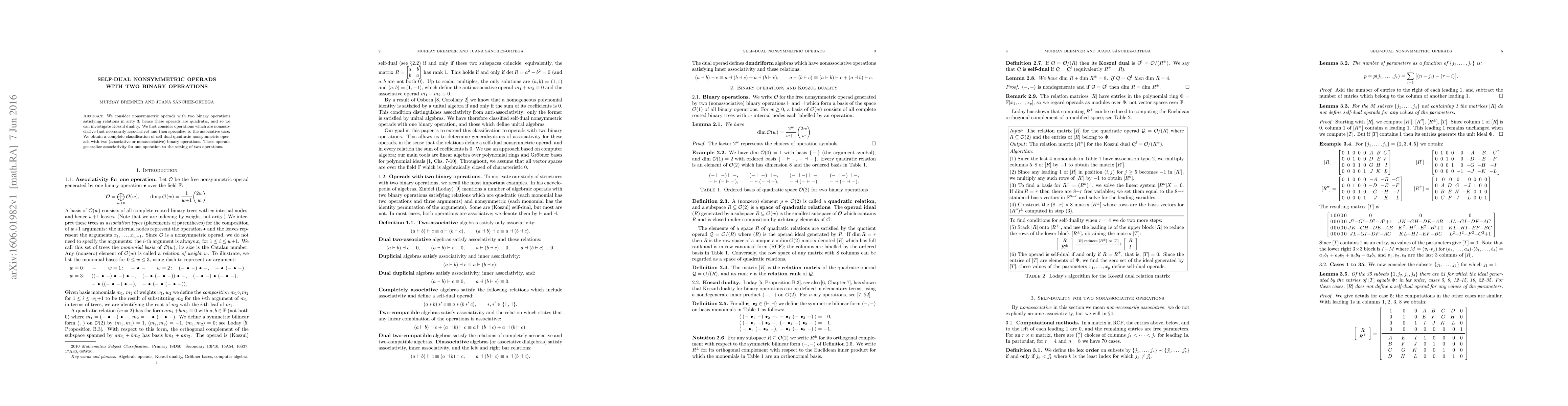 This paper classifies self-dual quadratic nonsymmetric operads with two binary operations, exploring both nonassociative and associative cases, and generalizes the concept of associativity for one operation to the setting of two operations. Koszul duality is utilized to investigate these structures.