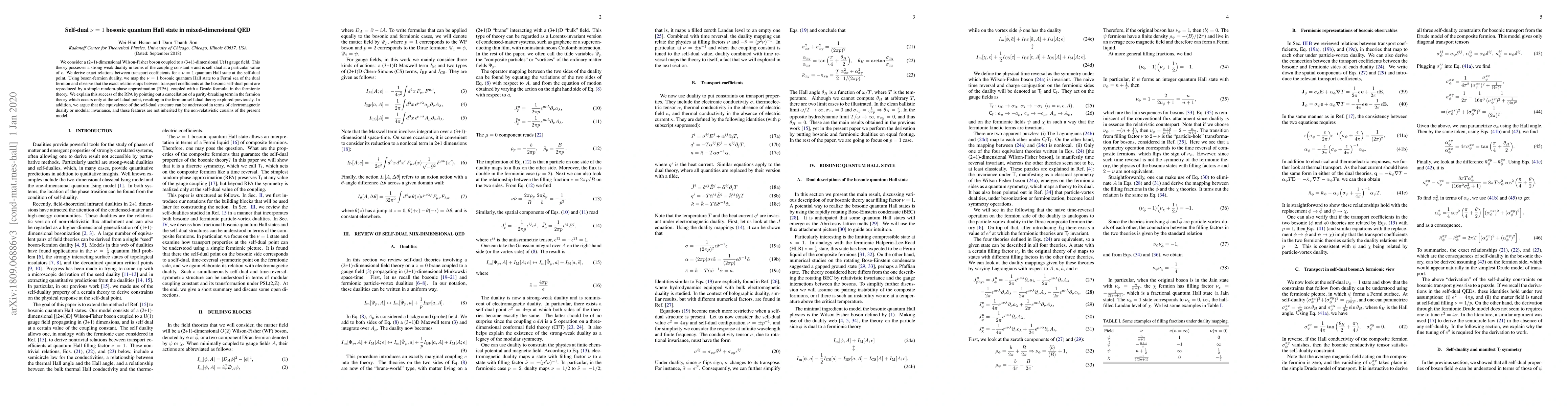 This paper explores a self-dual $\nu=1$ bosonic quantum Hall state in a mixed-dimensional QED framework, revealing strong-weak duality and deriving exact transport coefficient relations at the self-dual coupling. It uses boson-fermion duality to map the bosonic state to a Fermi sea, showing that the same transport relationships emerge in the fermionic theory via a random phase approximation.