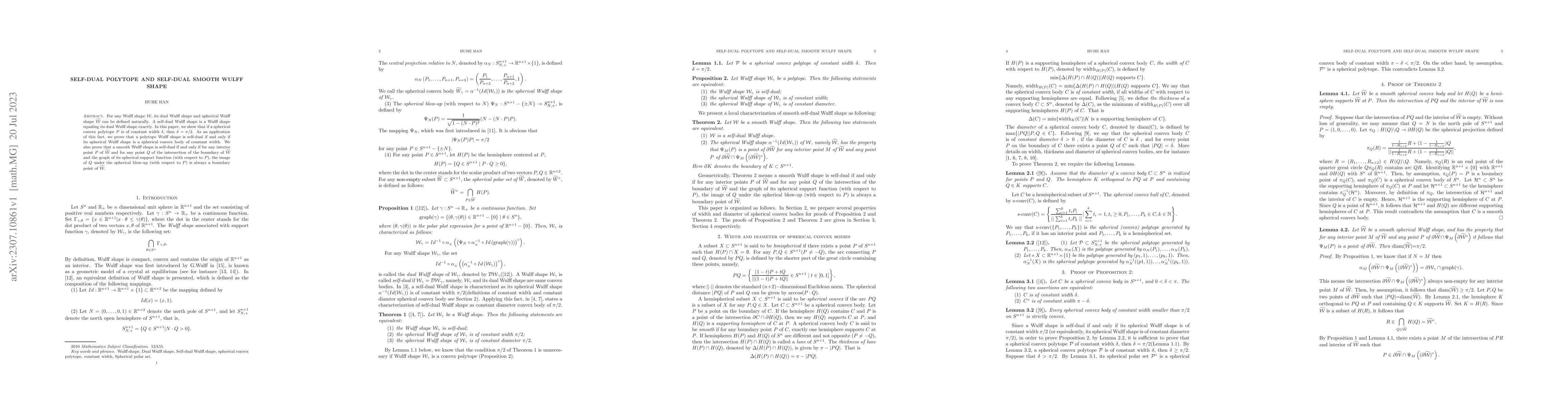 For any Wulff shape $\mathcal{W}$, its dual Wulff shape and spherical Wulff shape $\widetilde{\mathcal{W}}$ can be defined naturally. A self-dual Wulff shape is a Wulff shape equaling its dual Wulff shape exactly. In this paper, we show that if a spherical convex polytope $P$ is of constant width $\delta$, then $\delta=\pi/2$. As an application of this fact, we prove that a polytope Wulff shape is self-dual if and only if its spherical Wulff shape is a spherical convex body of constant width. We also prove that a smooth Wulff shape is self-dual if and only if for any interior point $P$ of $\widetilde{\mathcal{W}}$ and for any point $Q$ of the intersection of the boundary of $\widetilde{\mathcal{W}}$ and the graph of its spherical support function (with respect to $P$), the image of $Q$ under the spherical blow-up (with respect to $P$) is always a boundary point of $\widetilde{\mathcal{W}}$.