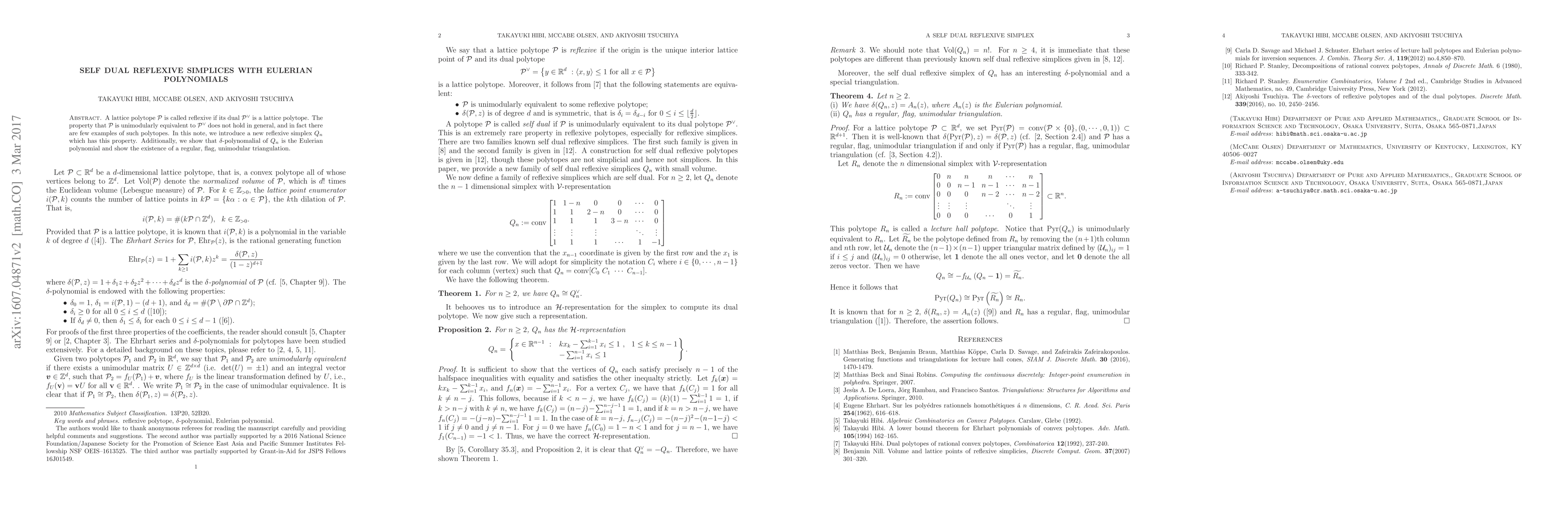 This paper introduces a new reflexive simplex $Q_n$ that is unimodularly equivalent to its dual, and demonstrates that its $\delta$-polynomial is the Eulerian polynomial. It also proves the existence of a regular, flag, unimodular triangulation for $Q_n$.