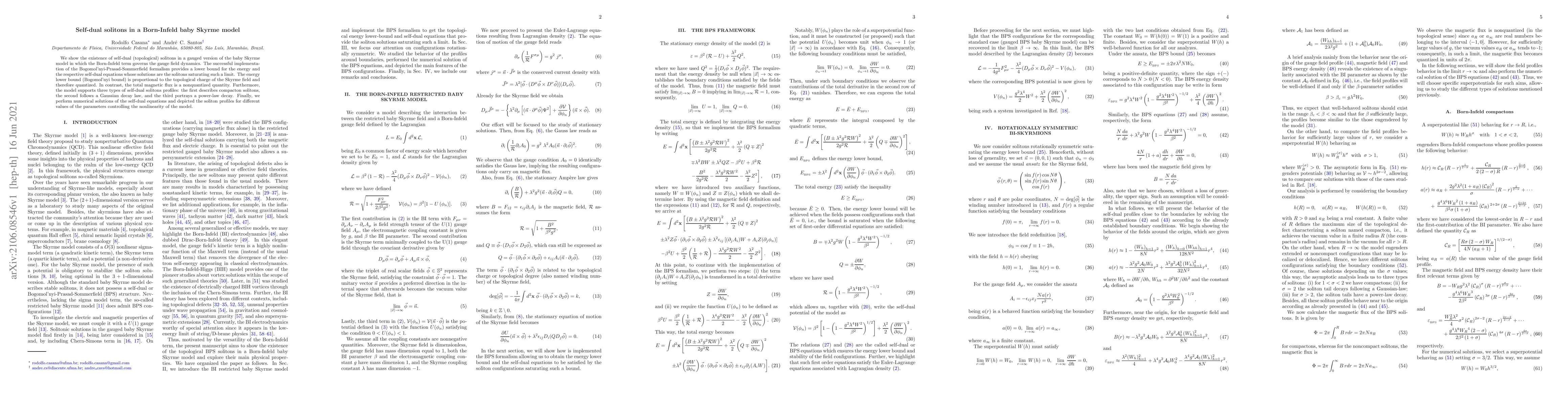 This paper demonstrates the existence of self-dual solitons in a gauged Born-Infeld baby Skyrme model, utilizing the Bogomol'nyi-Prasad-Sommerfield formalism to establish a quantized energy lower bound proportional to the topological charge. The model supports three distinct soliton profiles, including compactons, Gaussian, and power-law decays, with numerical solutions illustrating these profiles.