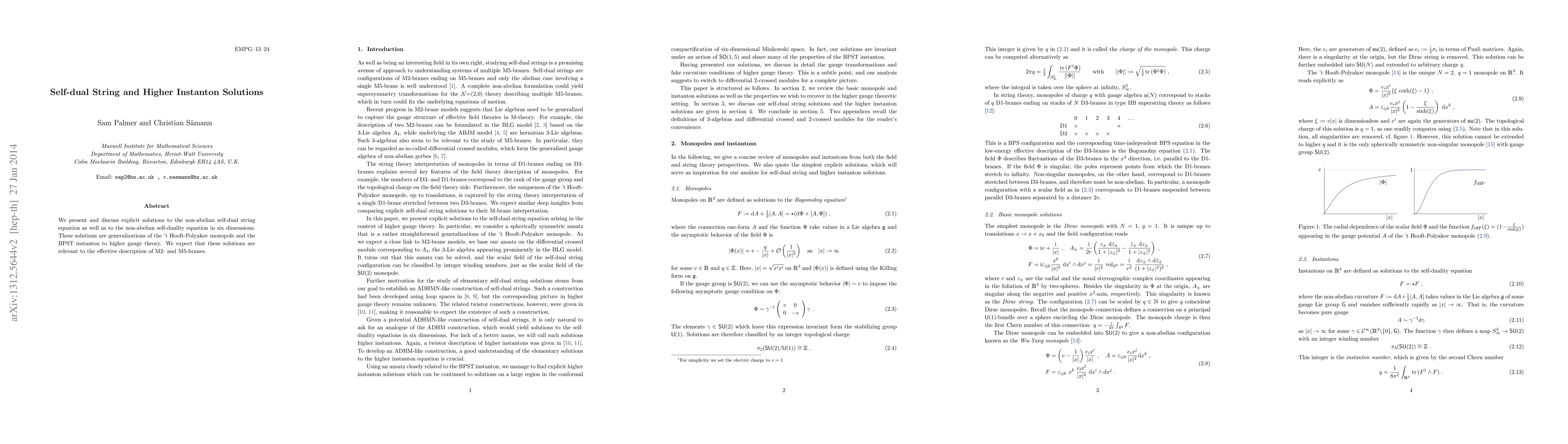 This paper presents explicit solutions to the non-abelian self-dual string equation and the non-abelian self-duality equation in six dimensions, generalizing 't Hooft-Polyakov monopoles and BPST instantons to higher gauge theories. These solutions are anticipated to be significant for the effective description of M2- and M5-branes.