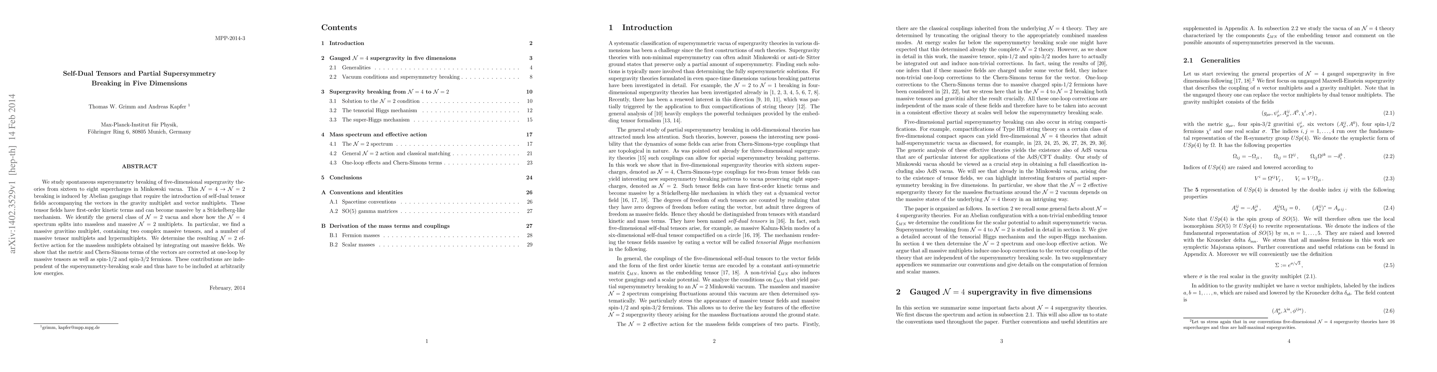 We study spontaneous supersymmetry breaking of five-dimensional supergravity theories from sixteen to eight supercharges in Minkowski vacua. This N=4 to N=2 breaking is induced by Abelian gaugings that require the introduction of self-dual tensor fields accompanying the vectors in the gravity multiplet and vector multiplets. These tensor fields have first-order kinetic terms and can become massive by a Stueckelberg-like mechanism. We identify the general class of N=2 vacua and show how the N=4 spectrum splits into massless and massive N=2 multiplets. In particular, we find a massive gravitino multiplet, containing two complex massive tensors, and a number of massive tensor multiplets and hypermultiplets. We determine the resulting N=2 effective action for the massless multiplets obtained by integrating out massive fields. We show that the metric and Chern-Simons terms of the vectors are corrected at one-loop by massive tensors as well as spin-1/2 and spin-3/2 fermions. These contributions are independent of the supersymmetry-breaking scale and thus have to be included at arbitrarily low energies.