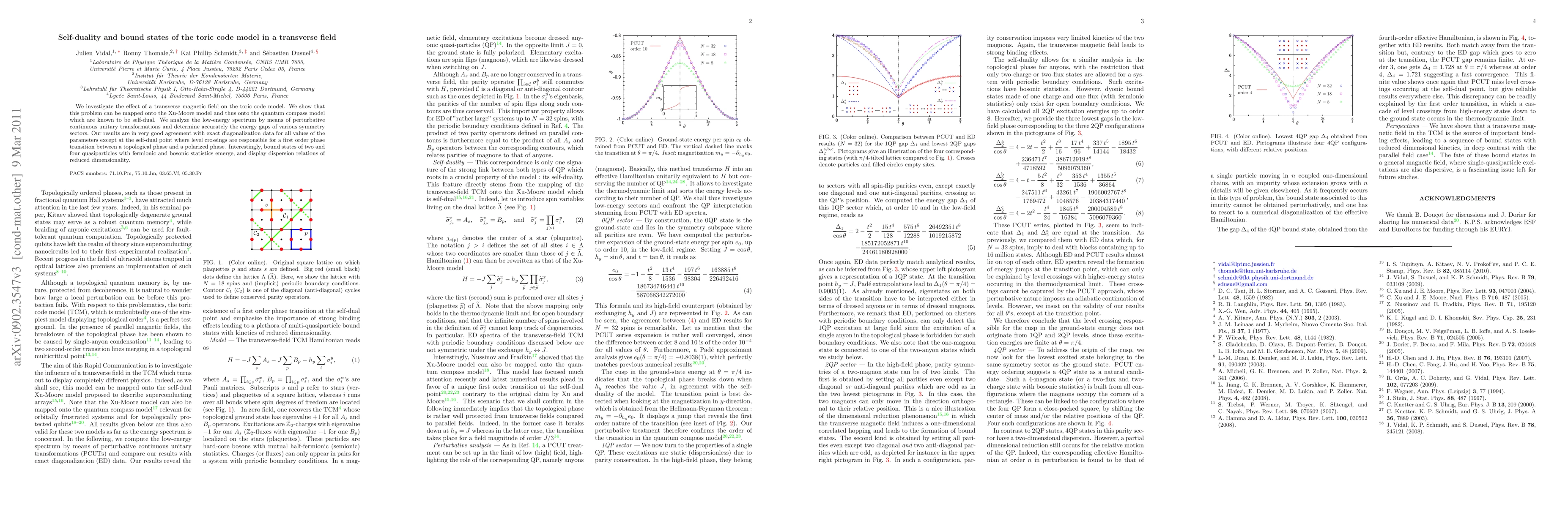 Researchers studied how a transverse magnetic field affects the toric code model, finding bound states of quasiparticles with reduced dimensionality and a phase transition between topological and polarized phases at the self-dual point.