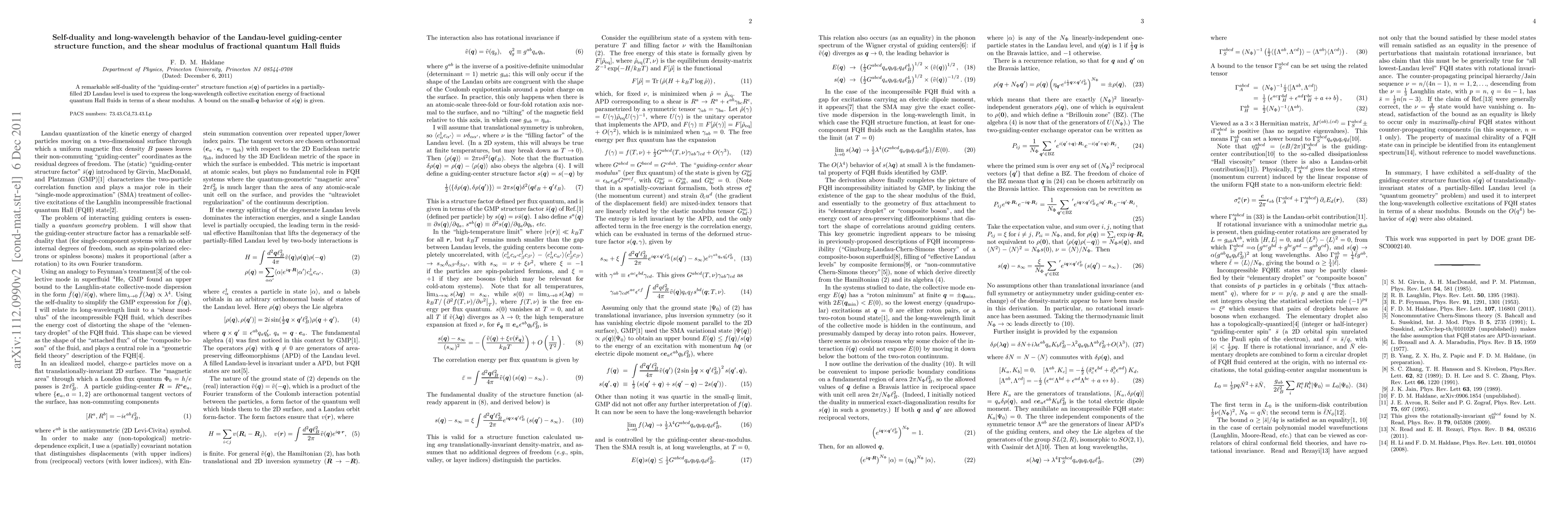 A remarkable self-duality of the "guiding-center" structure function s(q) of particles in a partially-filled 2D Landau level is used to express the long-wavelength collective excitation energy of fractional quantum Hall fluids in terms of a shear modulus. A bound on the small-q behavior of s(q) is given.