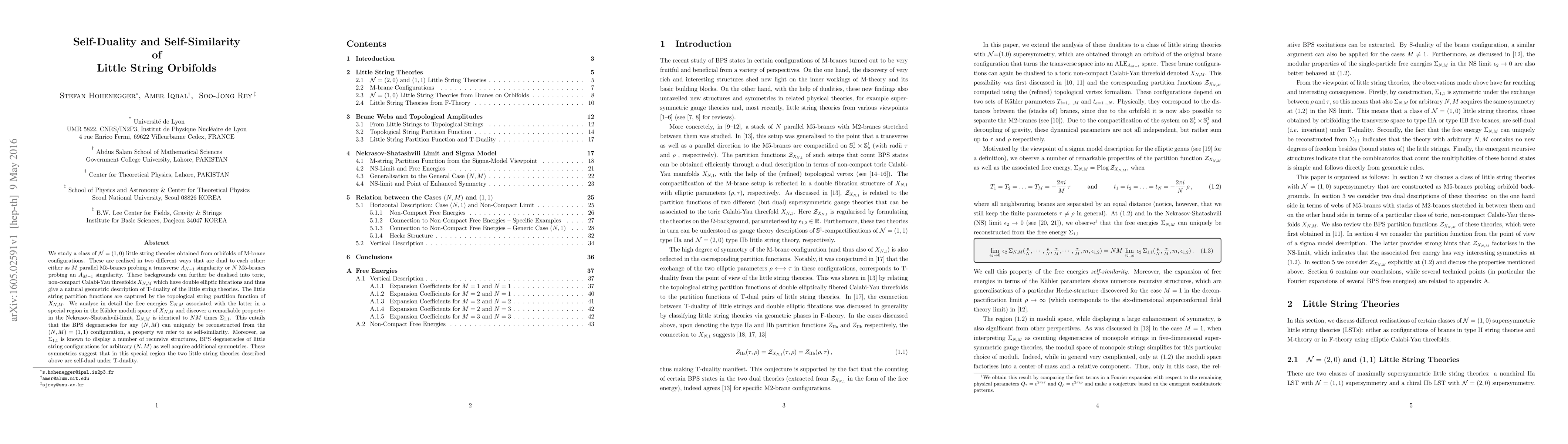 We study a class of ${\cal N}=(1,0)$ little string theories obtained from orbifolds of M-brane configurations. These are realised in two different ways that are dual to each other: either as $M$ parallel M5-branes probing a transverse $A_{N-1}$ singularity or $N$ M5-branes probing an $A_{M-1}$ singularity. These backgrounds can further be dualised into toric, non-compact Calabi-Yau threefolds $X_{N,M}$ which have double elliptic fibrations and thus give a natural geometric description of T-duality of the little string theories. The little string partition functions are captured by the topological string partition function of $X_{N,M}$. We analyse in detail the free energies $\Sigma_{N,M}$ associated with the latter in a special region in the K\"ahler moduli space of $X_{N,M}$ and discover a remarkable property: in the Nekrasov-Shatashvili-limit, $\Sigma_{N,M}$ is identical to $NM$ times $\Sigma_{1,1}$. This entails that the BPS degeneracies for any $(N,M)$ can uniquely be reconstructed from the $(N,M)=(1,1)$ configuration, a property we refer to as self-similarity. Moreover, as $\Sigma_{1,1}$ is known to display a number of recursive structures, BPS degeneracies of little string configurations for arbitrary $(N,M)$ as well acquire additional symmetries. These symmetries suggest that in this special region the two little string theories described above are self-dual under T-duality.