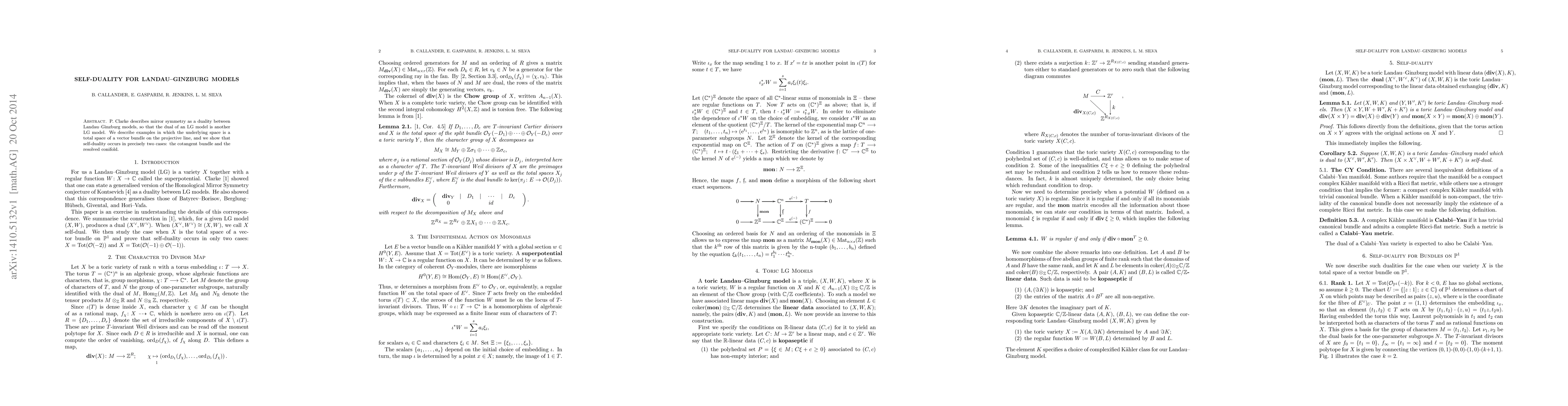 P. Clarke describes mirror symmetry as a duality between Landau--Ginzburg models, so that the dual of an LG model is another LG model. We describe examples in which the underlying space is a total space of a vector bundle on the projective line, and we show that self-duality occurs in precisely two cases: the cotangent bundle and the resolved conifold.