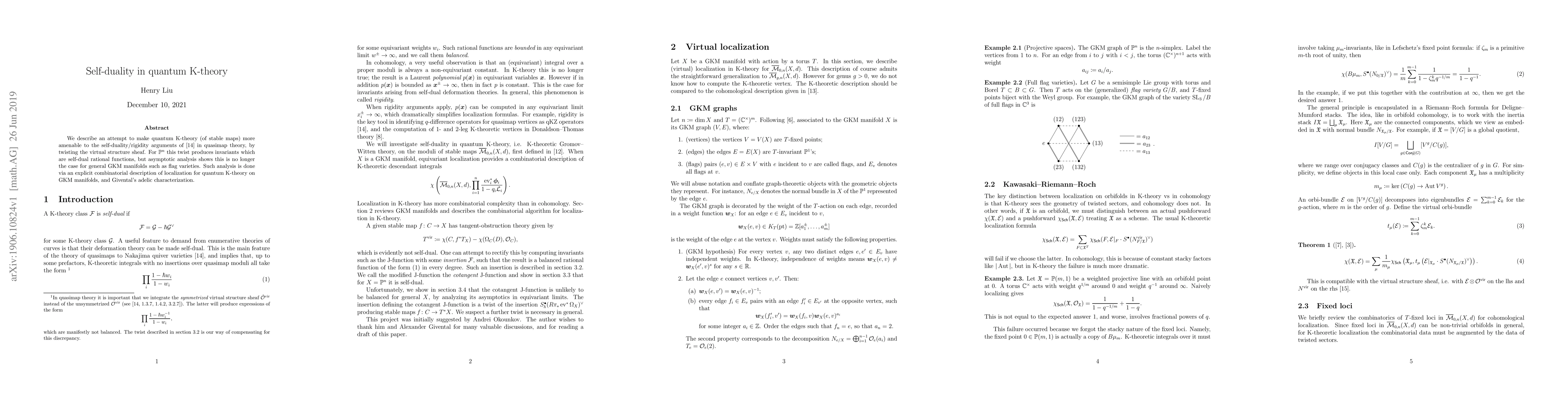 We describe an attempt to make quantum K-theory (of stable maps) more amenable to the self-duality/rigidity arguments of arXiv:1512.07363 in quasimap theory, by twisting the virtual structure sheaf. For $\mathbb{P}^n$ this twist produces invariants which are self-dual rational functions, but asymptotic analysis shows this is no longer the case for general GKM manifolds such as flag varieties. Such analysis is done via an explicit combinatorial description of localization for quantum K-theory on GKM manifolds, and Givental's adelic characterization.
