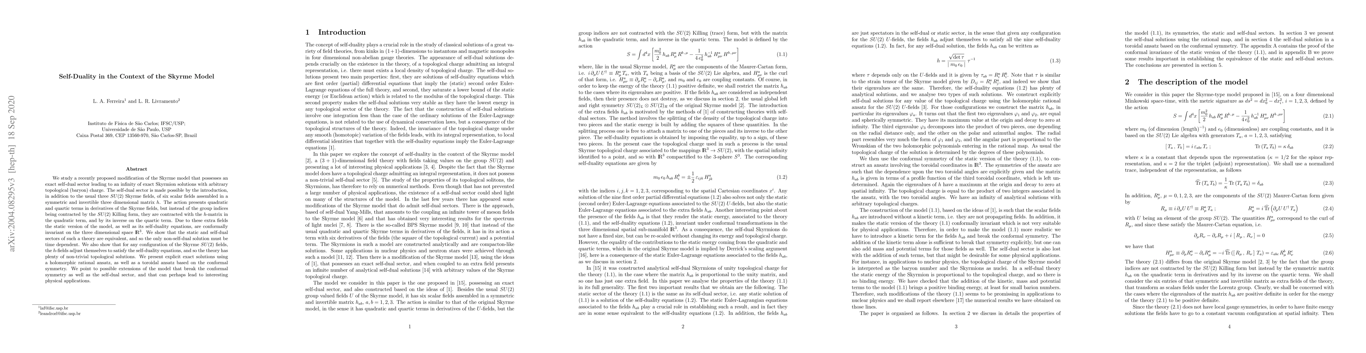 We study a recently proposed modification of the Skyrme model that possesses an exact self-dual sector leading to an infinity of exact Skyrmion solutions with arbitrary topological (baryon) charge. The self-dual sector is made possible by the introduction, in addition to the usual three SU(2) Skyrme fields, of six scalar fields assembled in a symmetric and invertible three dimensional matrix h. The action presents quadratic and quartic terms in derivatives of the Skyrme fields, but instead of the group indices being contracted by the SU(2) Killing form, they are contracted with the h-matrix in the quadratic term, and by its inverse on the quartic term. Due to these extra fields the static version of the model, as well as its self-duality equations, are conformally invariant on the three dimensional space R^3. We show that the static and self-dual sectors of such a theory are equivalent, and so the only non-self-dual solution must be time dependent. We also show that for any configuration of the Skyrme SU(2) fields, the h-fields adjust themselves to satisfy the self-duality equations, and so the theory has plenty of non-trivial topological solutions. We present explicit exact solutions using a holomorphic rational ansatz, as well as a toroidal ansatz based on the conformal symmetry. We point to possible extensions of the model that break the conformal symmetry as well as the self-dual sector, and that can perhaps lead to interesting physical applications.