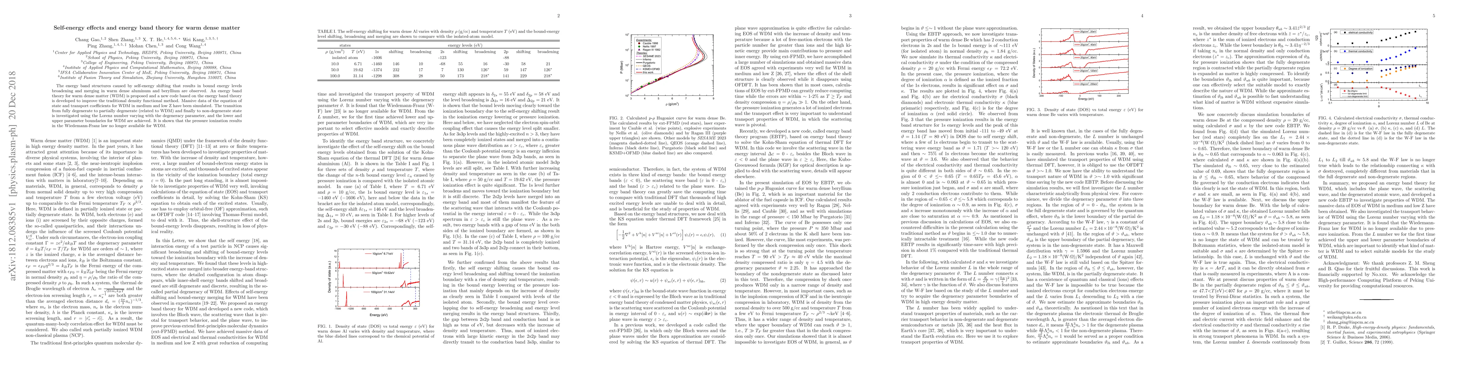 The energy band structures caused by self-energy shifting that results in bound energy levels broadening and merging in warm dense aluminum and beryllium are observed. An energy band theory for warm dense matter (WDM) is proposed and a new code based on the energy band theory is developed to improve the traditional density functional method. Massive data of the equation of state and transport coefficients for WDM in medium and low Z have been simulated. The transition from fully degenerate to partially degenerate (related to WDM) and finally to non-degenerate state is investigated using the Lorenz number varying with the degeneracy parameter, and the lower and upper parameter boundaries for WDM are achieved. It is shown that the pressure ionization results in the Wiedemann-Franz law no longer available for WDM.
