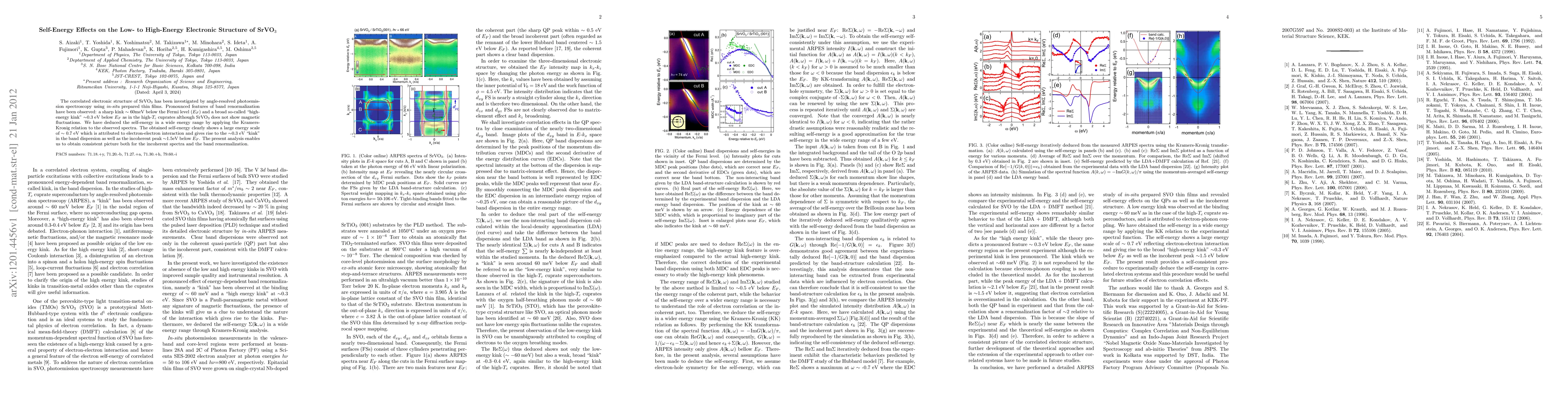 The correlated electronic structure of SrVO3 has been investigated by angle-resolved photoemission spectroscopy using in-situ prepared thin films. Pronounced features of band renormalization have been observed: a sharp kink ~60 meV below the Fermi level (EF) and a broad so-called "high-energy kink" ~0.3 eV below EF as in the high-Tc cuprates although SrVO3 does not show magnetic fluctuations. We have deduced the self-energy in a wide energy range by applying the Kramers-Kronig relation to the observed spectra. The obtained self-energy clearly shows a large energy scale of ~0.7 eV which is attributed to electron-electron interaction and gives rise to the ~0.3 eV "kink" in the band dispersion as well as the incoherent peak ~1.5eV below EF. The present analysis enables us to obtain consistent picture both for the incoherent spectra and the band renormalization.