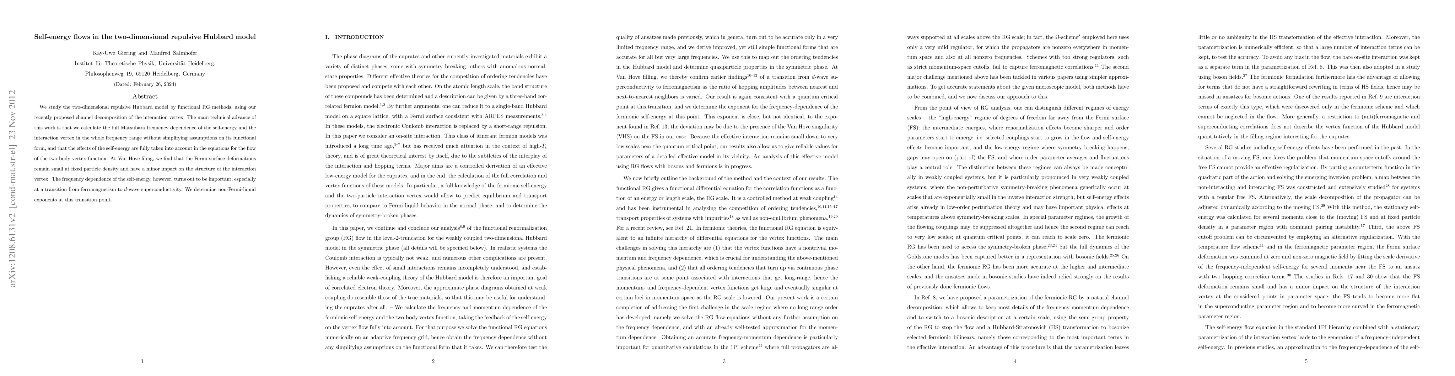 We study the two-dimensional repulsive Hubbard model by functional RG methods, using our recently proposed channel decomposition of the interaction vertex. The main technical advance of this work is that we calculate the full Matsubara frequency dependence of the self-energy and the interaction vertex in the whole frequency range without simplifying assumptions on its functional form, and that the effects of the self-energy are fully taken into account in the equations for the flow of the two-body vertex function. At Van Hove filling, we find that the Fermi surface deformations remain small at fixed particle density and have a minor impact on the structure of the interaction vertex. The frequency dependence of the self-energy, however, turns out to be important, especially at a transition from ferromagnetism to d-wave superconductivity. We determine non-Fermi-liquid exponents at this transition point.