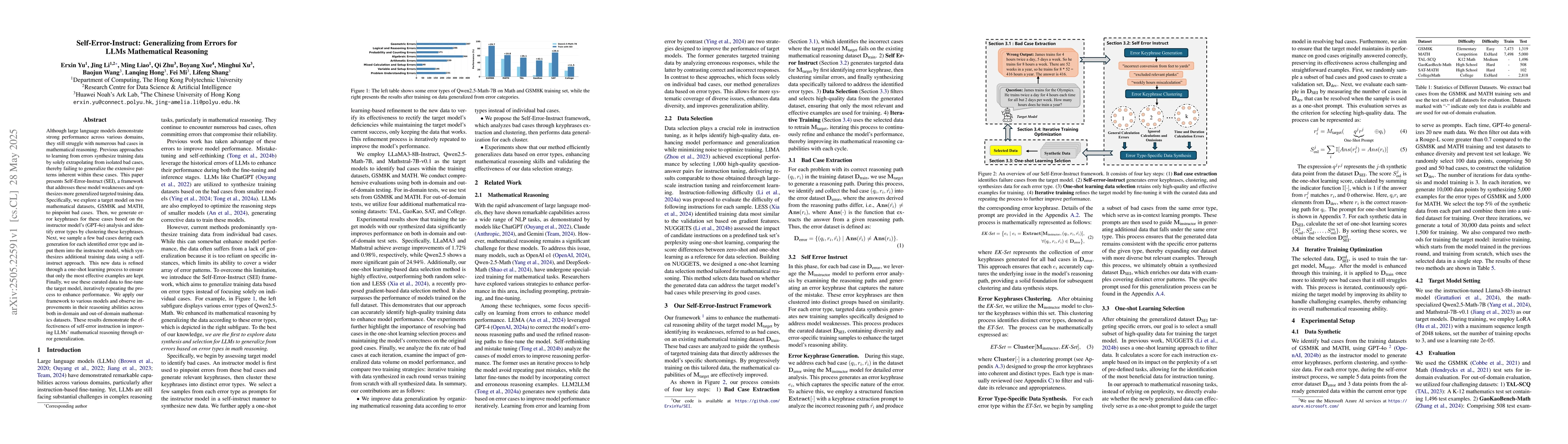 The research introduces Self-Error-Instruct (SEI), a framework that identifies bad cases in mathematical datasets (GSM8K and MATH), generates error keyphrases using an instructor model (GPT-4o), clusters these keyphrases to identify error types, samples bad cases for each error type, synthesizes new training data via self-instruct approach, refines this data through one-shot learning, and iteratively fine-tunes target models to enhance mathematical reasoning abilities.
