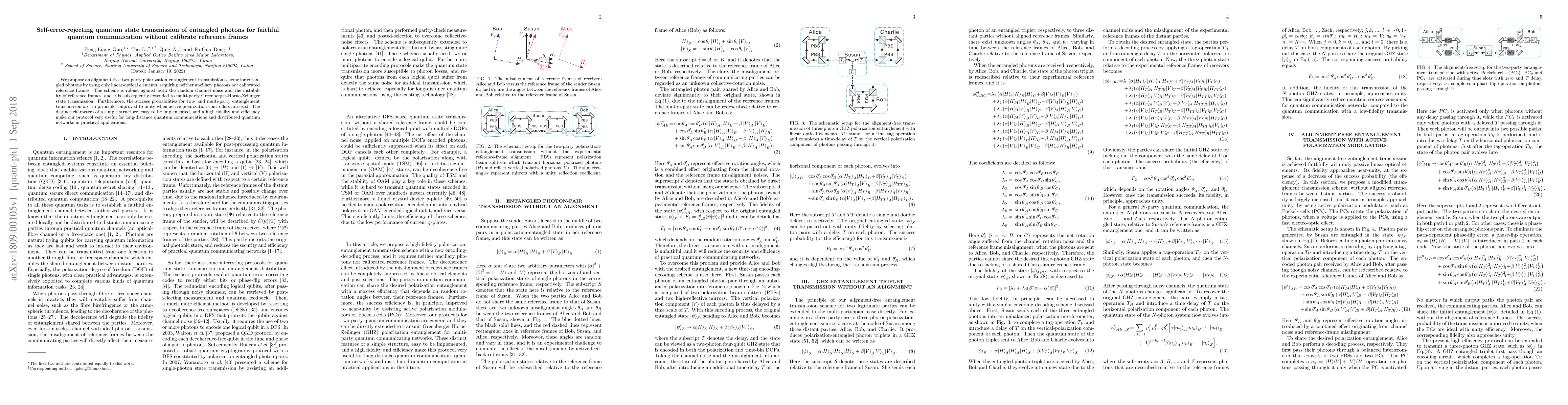 The paper introduces alignment-free quantum state transmission protocols for entangled photons, leveraging passive linear optical elements and active polarization modulators, which maintain high fidelity and success probabilities.