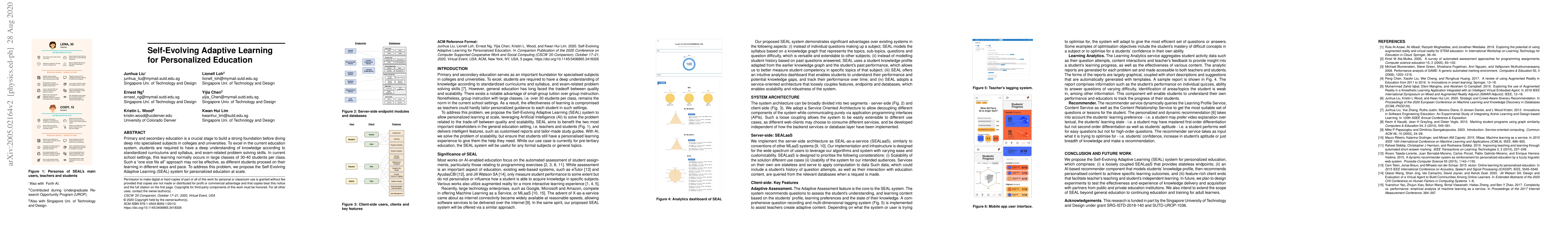 Primary and secondary education is a crucial stage to build a strong foundation before diving deep into specialised subjects in colleges and universities. To excel in the current education system, students are required to have a deep understanding of knowledge according to standardized curriculums and syllabus, and exam-related problem solving skills. In current school settings, this learning normally occurs in large classes of 30-40 students per class. Such a ``one size fits all'' approach may not be effective, as different students proceed on their learning in different ways and pace. To address this problem, we propose the Self-Evolving Adaptive Learning (SEAL) system for personalized education at scale.