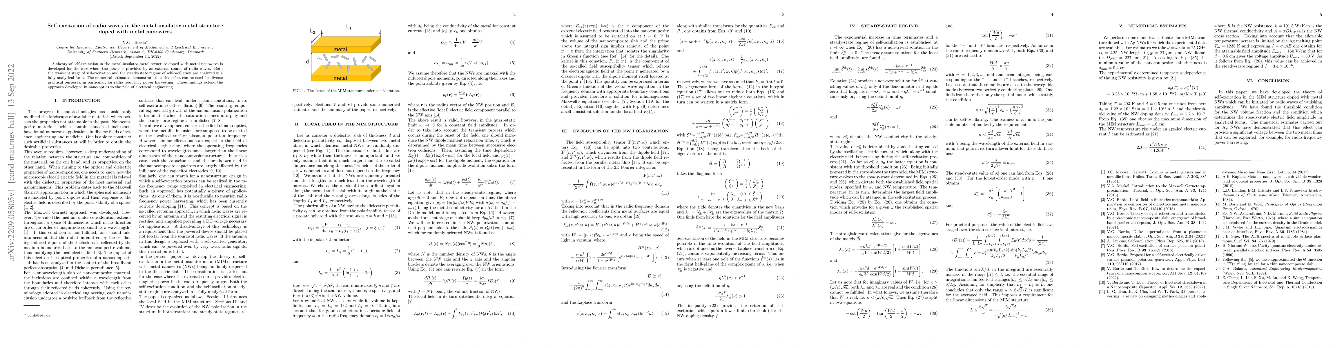 This paper develops a theoretical framework for self-excitation in metal-insulator-metal structures doped with metal nanowires, analyzing both transient and steady-state regimes. The findings suggest practical applications, such as radio frequency power harvesting, extending nano-optics approaches to electrical engineering.