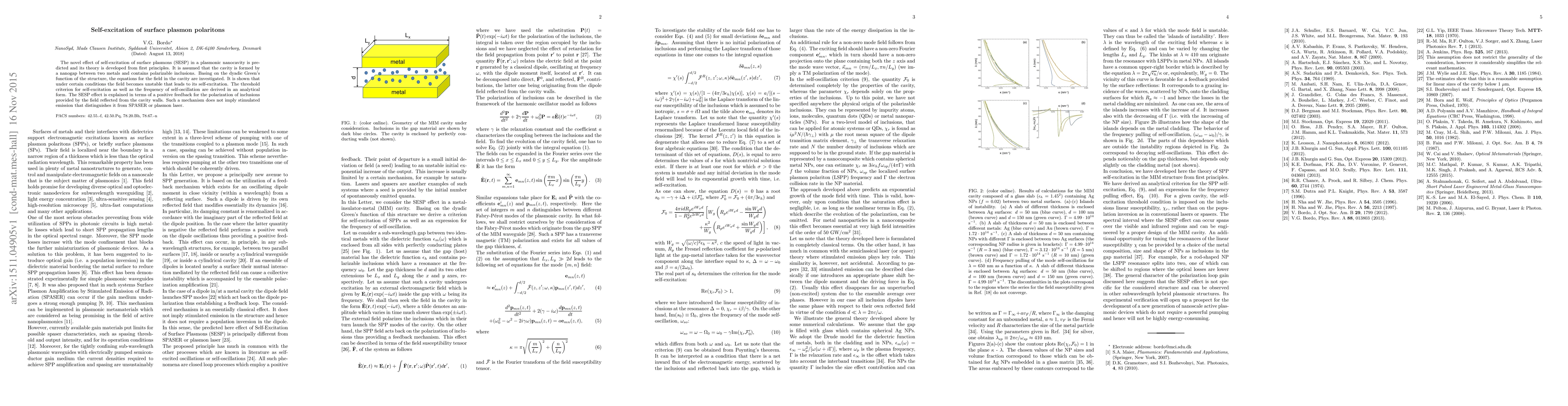 This paper develops a theoretical framework for the self-excitation of surface plasmons (SESP) in a plasmonic nanocavity, showing that under specific conditions, the field becomes unstable and self-oscillates due to positive feedback from the cavity walls. Unlike SPASERs, this effect does not rely on stimulated emission.