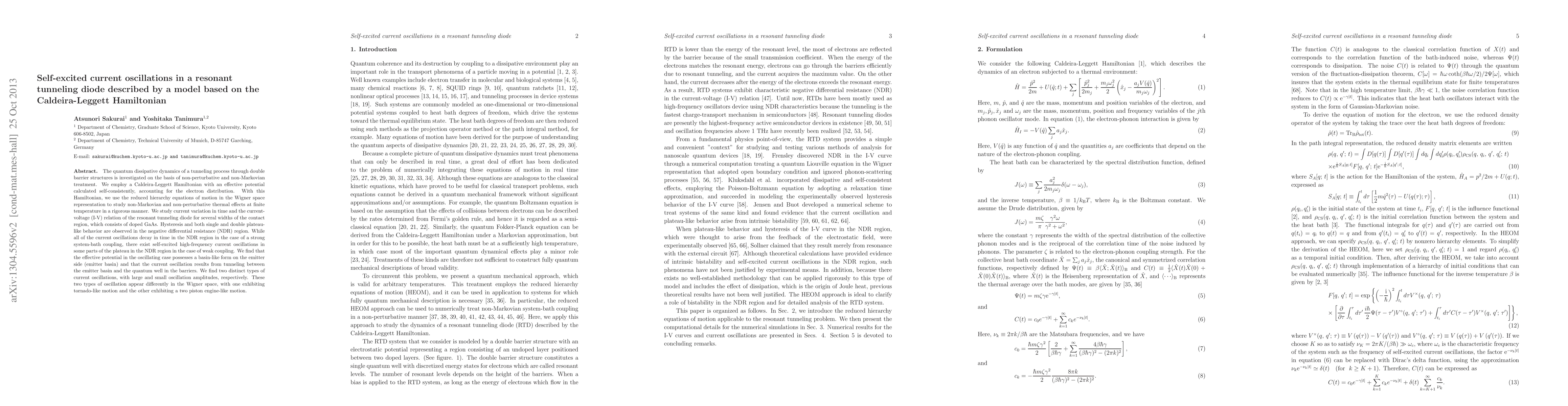 The quantum dissipative dynamics of a tunneling process through double barrier structures is investigated on the basis of non-perturbative and non-Markovian treatment. We employ a Caldeira-Leggett Hamiltonian with an effective potential calculated self-consistently, accounting for the electron distribution. With this Hamiltonian, we use the reduced hierarchy equations of motion in the Wigner space representation to study non-Markovian and non-perturbative thermal effects at finite temperature in a rigorous manner. We study current variation in time and the current-voltage (I-V) relation of the resonant tunneling diode for several widths of the contact region, which consists of doped GaAs. Hysteresis and both single and double plateau-like behavior are observed in the negative differential resistance (NDR) region. While all of the current oscillations decay in time in the NDR region in the case of a strong system-bath coupling, there exist self-excited high-frequency current oscillations in some parts of the plateau in the NDR region in the case of weak coupling. We find that the effective potential in the oscillating case possesses a basin-like form on the emitter side (emitter basin) and that the current oscillation results from tunneling between the emitter basin and the quantum well in the barriers. We find two distinct types of current oscillations, with large and small oscillation amplitudes, respectively. These two types of oscillation appear differently in the Wigner space, with one exhibiting tornado-like motion and the other exhibiting a two piston engine-like motion.