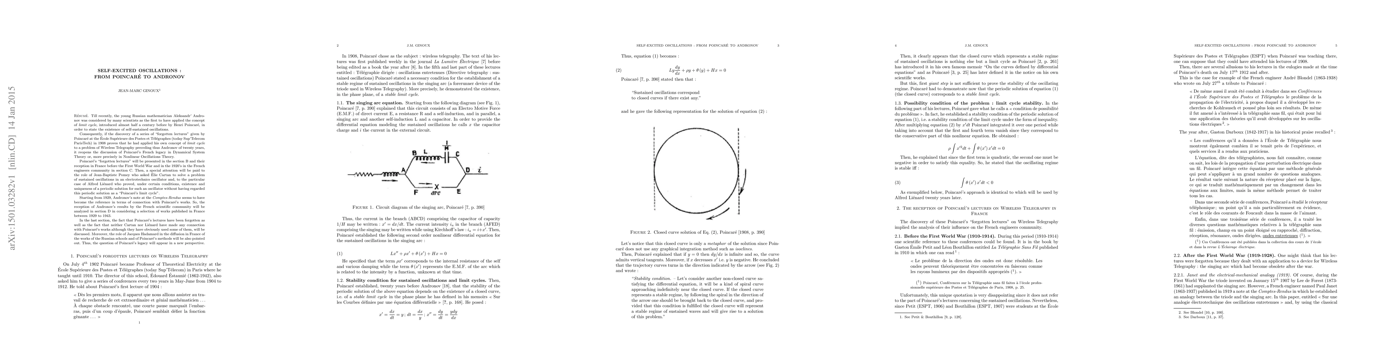 In 1908 Henri Poincar\'e gave a series of 'forgotten lectures' on wireless telegraphy in which he demonstrated the existence of a stable limit cycle in the phase plane. In 1929 Aleksandr Andronov published a short note in the Comptes Rendus in which he stated that there is a correspondence between the periodic solution of self-oscillating systems and the concept of stable limit cycles introduced by Poincar\'e. In this article Jean-Marc Ginoux describes these two major contributions to the development of non-linear oscillation theory and their reception in France.