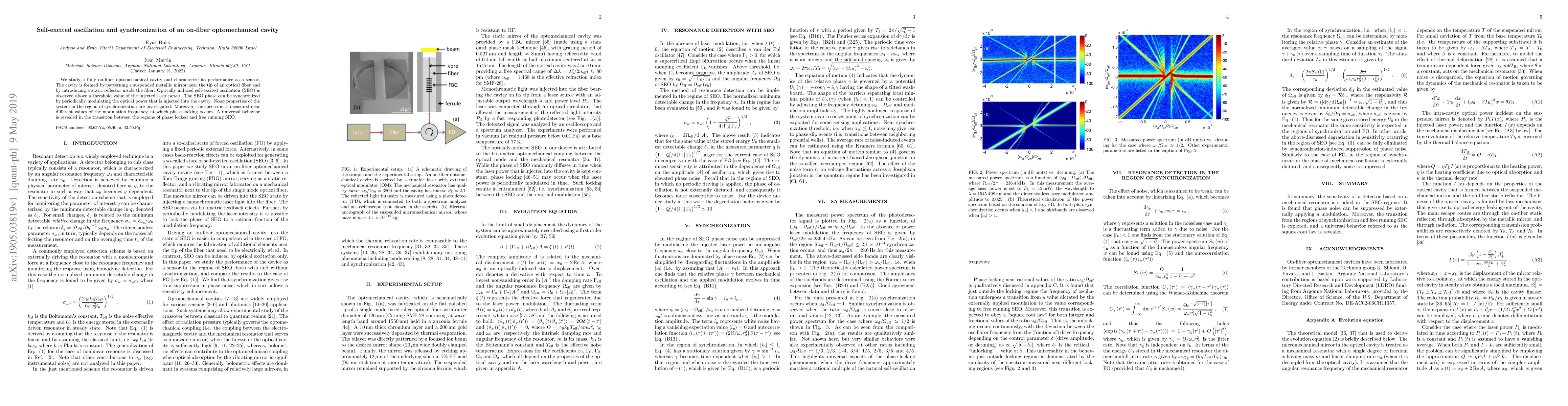 We study a fully on-fiber optomechanical cavity and characterize its performance as a sensor. The cavity is formed by patterning a suspended metallic mirror near the tip of an optical fiber and by introducing a static reflector inside the fiber. Optically induced self-excited oscillation (SEO) is observed above a threshold value of the injected laser power. The SEO phase can be synchronized by periodically modulating the optical power that is injected into the cavity. Noise properties of the system in the region of synchronization are investigated. Moreover, the spectrum is measured near different values of the modulation frequency, at which phase locking occurs. A universal behavior is revealed in the transition between the regions of phase locked and free running SEO.