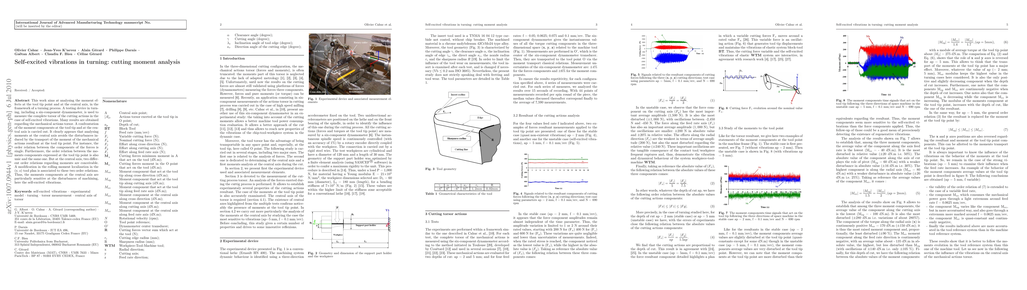 This work aims at analysing the moment effects at the tool tip point and at the central axis, in the framework of a turning process. A testing device in turning, including a six-component dynamometer, is used to measure the complete torsor of the cutting actions in the case of self-excited vibrations. Many results are obtained regarding the mechanical actions torsor. A confrontation of the moment components at the tool tip and at the central axis is carried out. It clearly appears that analysing moments at the central axis avoids the disturbances induced by the transport of the moment of the mechanical actions resultant at the tool tip point. For instance, the order relation between the components of the forces is single. Furthermore, the order relation between the moments components expressed at the tool tip point is also single and the same one. But at the central axis, two different order relations regarding moments are conceivable. A modification in the rolling moment localization in the (y, z) tool plan is associated to these two order relations. Thus, the moments components at the central axis are particularly sensitive at the disturbances of machining, here the self-excited vibrations.