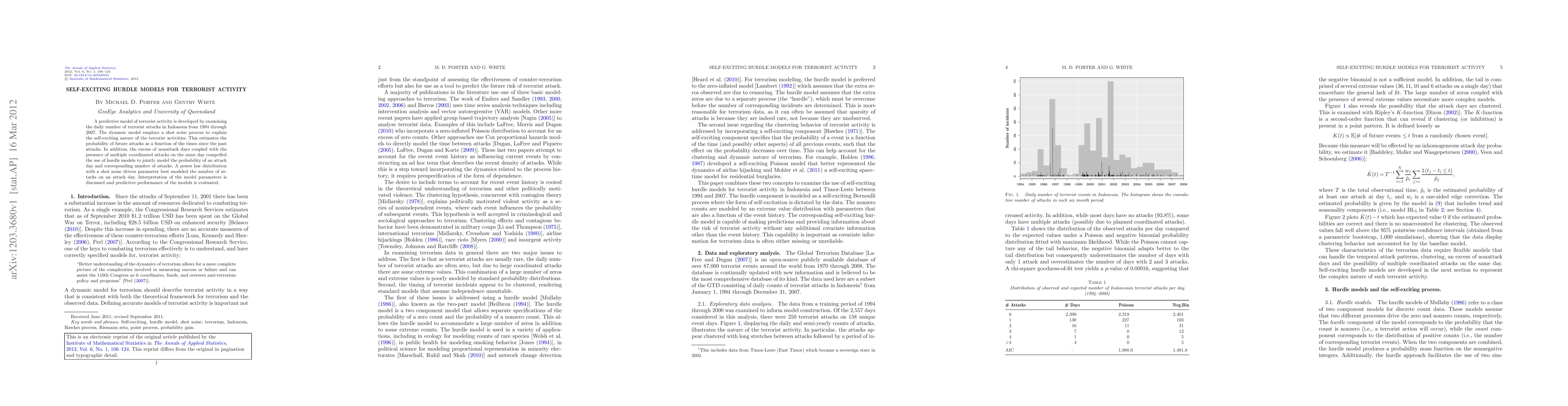 This paper develops a self-exciting hurdle model to predict terrorist activity in Indonesia from 1994 to 2007, using a shot noise process to account for the self-exciting nature of attacks and a hurdle model to handle nonattack days and multiple attacks. The model's predictive performance is evaluated and discussed.