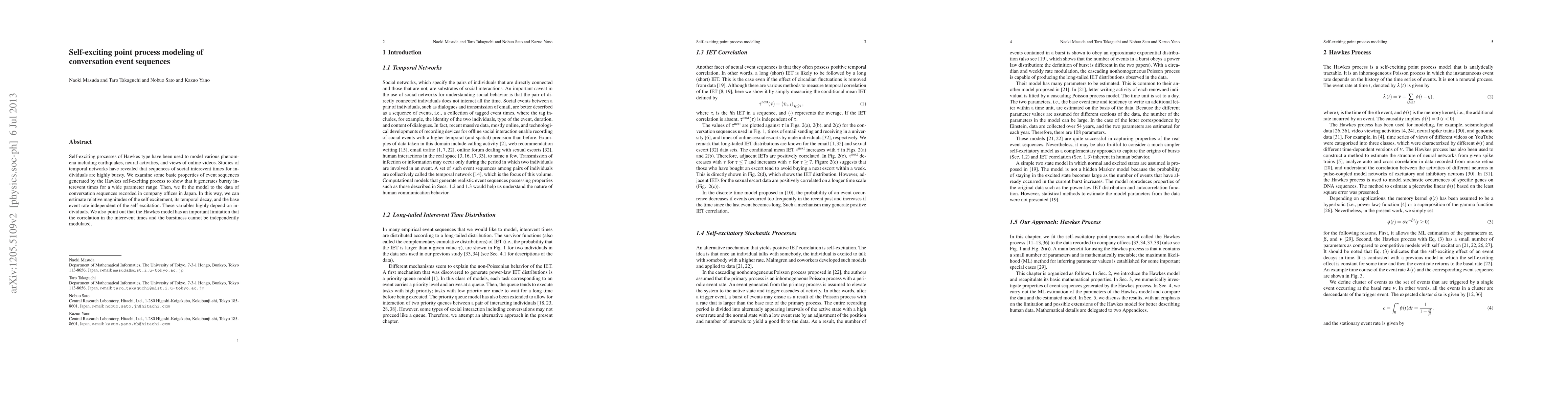 This paper explores the application of Hawkes self-exciting point processes to model bursty conversation event sequences in company offices. The study finds that the model effectively captures individual-dependent burstiness and self-excitation parameters, but notes a limitation in independently modulating correlation and burstiness.