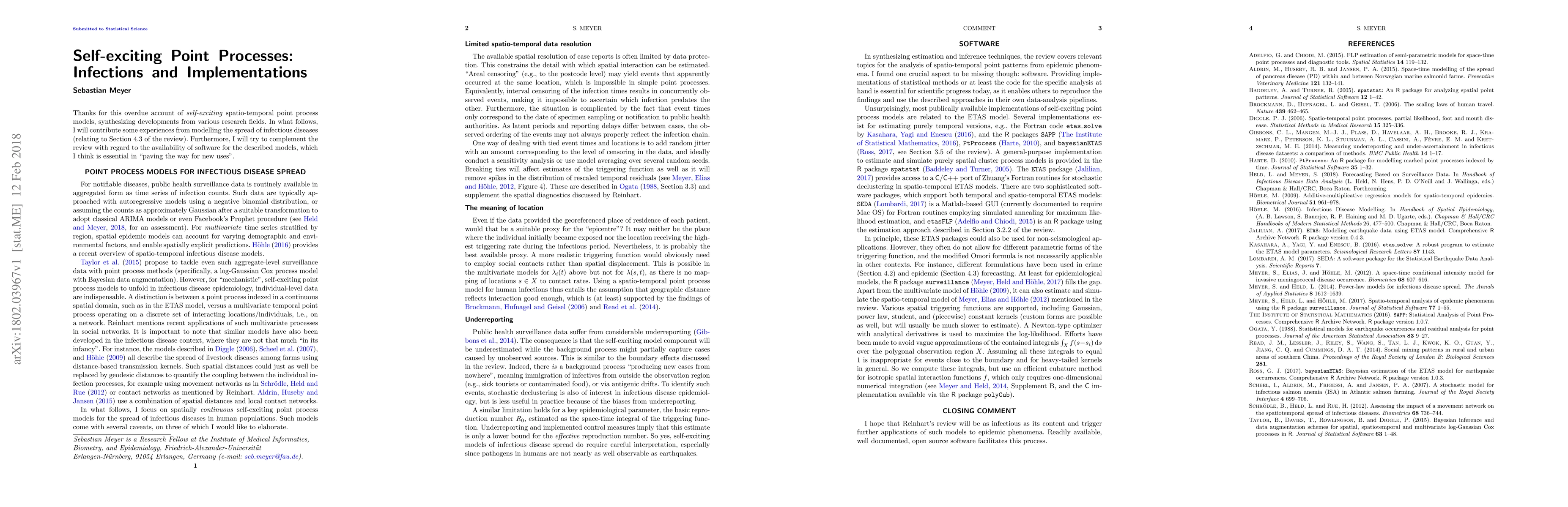 This is a comment on Reinhart's "Review of Self-Exciting Spatio-Temporal Point Processes and Their Applications" (arXiv:1708.02647v1). I contribute some experiences from modelling the spread of infectious diseases. Furthermore, I try to complement the review with regard to the availability of software for the described models, which I think is essential in "paving the way for new uses".