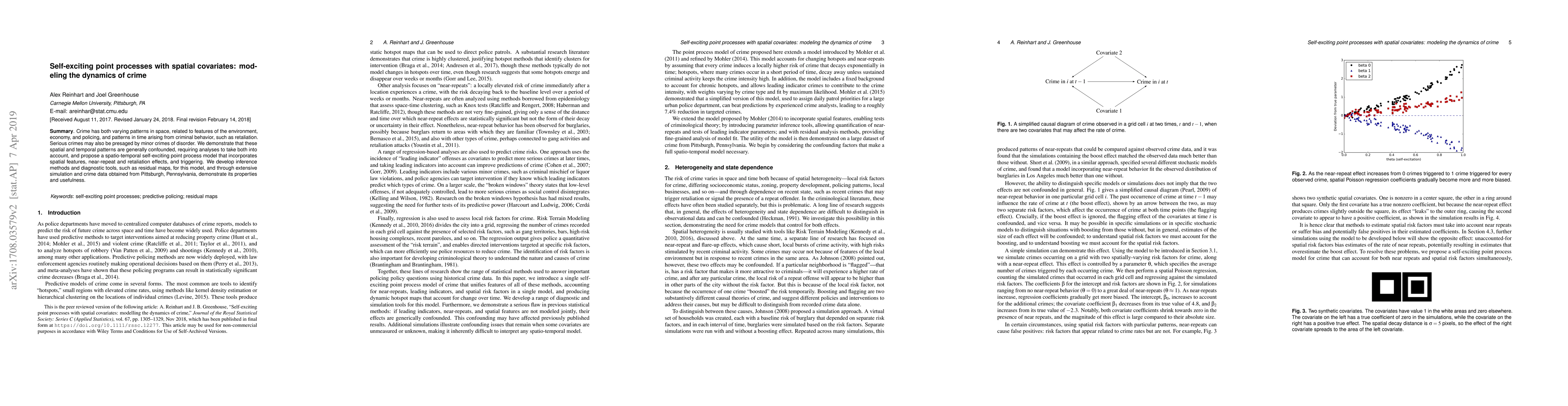 Crime has both varying patterns in space, related to features of the environment, economy, and policing, and patterns in time arising from criminal behavior, such as retaliation. Serious crimes may also be presaged by minor crimes of disorder. We demonstrate that these spatial and temporal patterns are generally confounded, requiring analyses to take both into account, and propose a spatio-temporal self-exciting point process model which incorporates spatial features, near-repeat and retaliation effects, and triggering. We develop inference methods and diagnostic tools, such as residual maps, for this model, and through extensive simulation and crime data obtained from Pittsburgh, Pennsylvania, demonstrate its properties and usefulness.