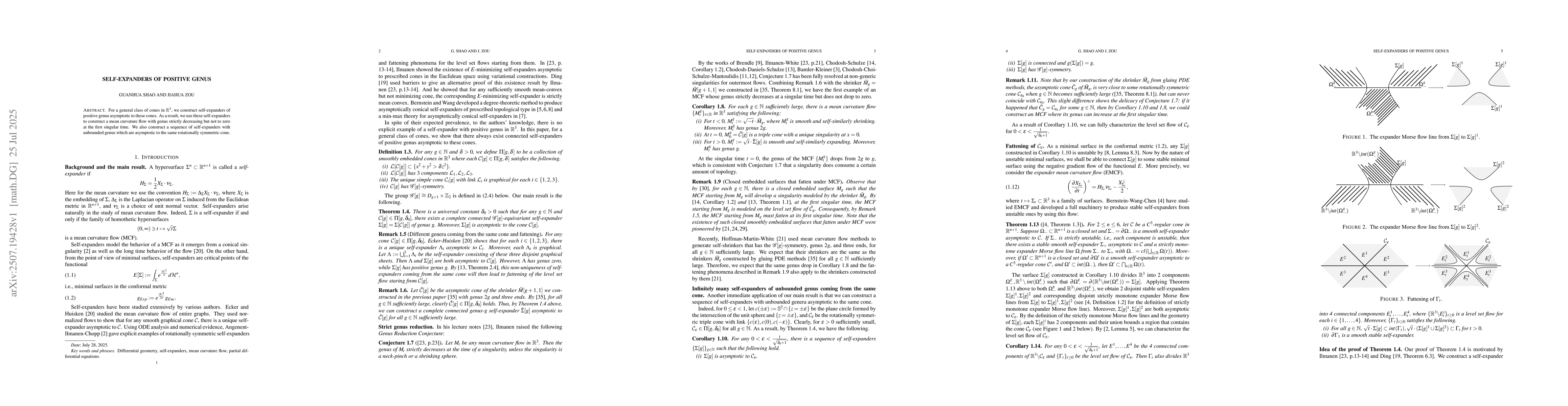 For a general class of cones in $\mathbb{R}^3$, we construct self-expanders of positive genus asymptotic to these cones. As a result, we use these self-expanders to construct a mean curvature flow with genus strictly decreasing but not to zero at the first singular time. We also construct a sequence of self-expanders with unbounded genus which are asymptotic to the same rotationally symmetric cone.