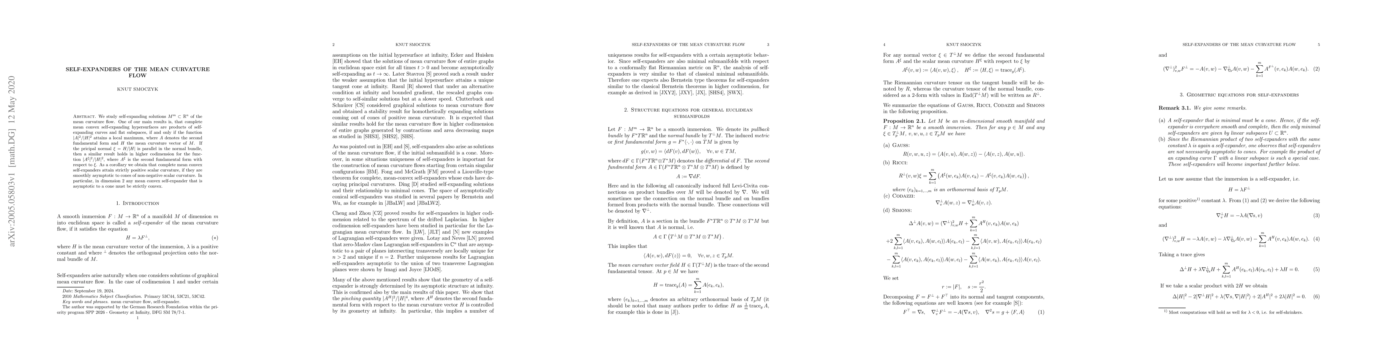 We study self-expanding solutions $M^m\subset\mathbb{R}^{n}$ of the mean curvature flow. One of our main results is, that complete mean convex self-expanding hypersurfaces are products of self-expanding curves and flat subspaces, if and only if the function $|A|^2/|H|^2$ attains a local maximum, where $A$ denotes the second fundamental form and $H$ the mean curvature vector of $M$. If the pricipal normal $\xi=H/|H|$ is parallel in the normal bundle, then a similar result holds in higher codimension for the function $|A^\xi|^2/|H|^2$, where $A^\xi$ is the second fundamental form with respect to $\xi$. As a corollary we obtain that complete mean convex self-expanders attain strictly positive scalar curvature, if they are smoothly asymptotic to cones of non-negative scalar curvature. In particular, in dimension $2$ any mean convex self-expander that is asymptotic to a cone must be strictly convex.