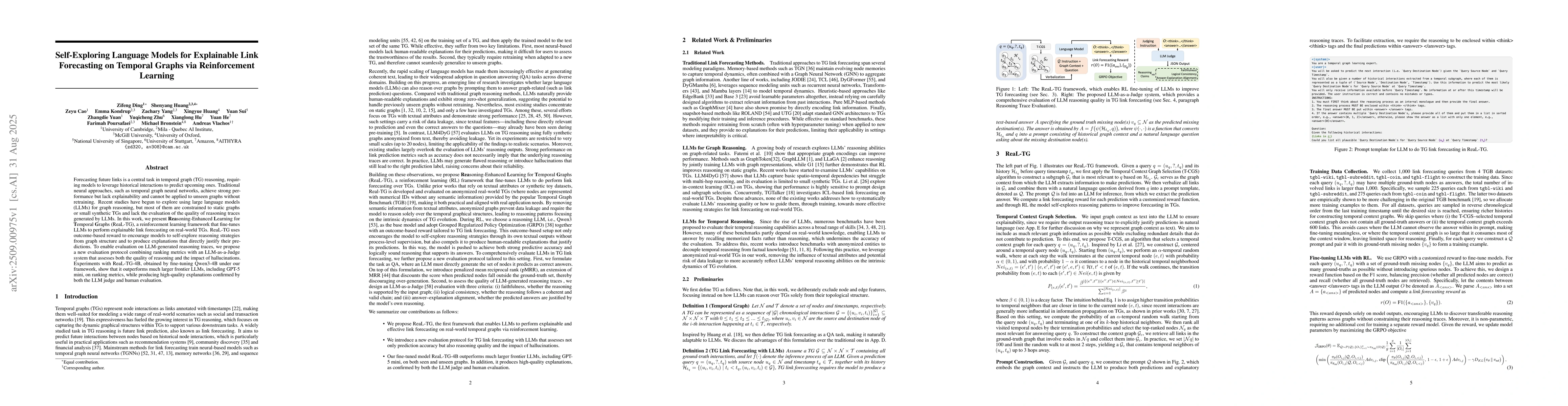 Forecasting future links is a central task in temporal graph (TG) reasoning, requiring models to leverage historical interactions to predict upcoming ones. Traditional neural approaches, such as temporal graph neural networks, achieve strong performance but lack explainability and cannot be applied to unseen graphs without retraining. Recent studies have begun to explore using large language models (LLMs) for graph reasoning, but most of them are constrained to static graphs or small synthetic TGs and lack the evaluation of the quality of reasoning traces generated by LLMs. In this work, we present Reasoning-Enhanced Learning for Temporal Graphs (ReaL-TG), a reinforcement learning framework that fine-tunes LLMs to perform explainable link forecasting on real-world TGs. ReaL-TG uses outcome-based reward to encourage models to self-explore reasoning strategies from graph structure and to produce explanations that directly justify their predictions. To enable evaluation on LLM-generated reasoning traces, we propose a new evaluation protocol combining ranking metrics with an LLM-as-a-Judge system that assesses both the quality of reasoning and the impact of hallucinations. Experiments with ReaL-TG-4B, obtained by fine-tuning Qwen3-4B under our framework, show that it outperforms much larger frontier LLMs, including GPT-5 mini, on ranking metrics, while producing high-quality explanations confirmed by both the LLM judge and human evaluation.