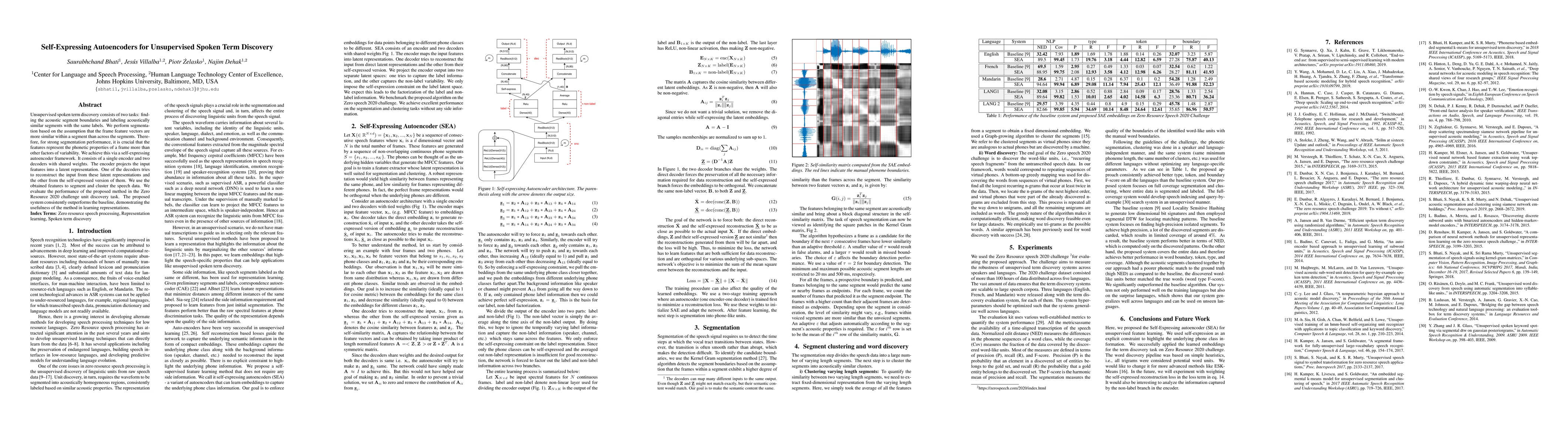 Unsupervised spoken term discovery consists of two tasks: finding the acoustic segment boundaries and labeling acoustically similar segments with the same labels. We perform segmentation based on the assumption that the frame feature vectors are more similar within a segment than across the segments. Therefore, for strong segmentation performance, it is crucial that the features represent the phonetic properties of a frame more than other factors of variability. We achieve this via a self-expressing autoencoder framework. It consists of a single encoder and two decoders with shared weights. The encoder projects the input features into a latent representation. One of the decoders tries to reconstruct the input from these latent representations and the other from the self-expressed version of them. We use the obtained features to segment and cluster the speech data. We evaluate the performance of the proposed method in the Zero Resource 2020 challenge unit discovery task. The proposed system consistently outperforms the baseline, demonstrating the usefulness of the method in learning representations.