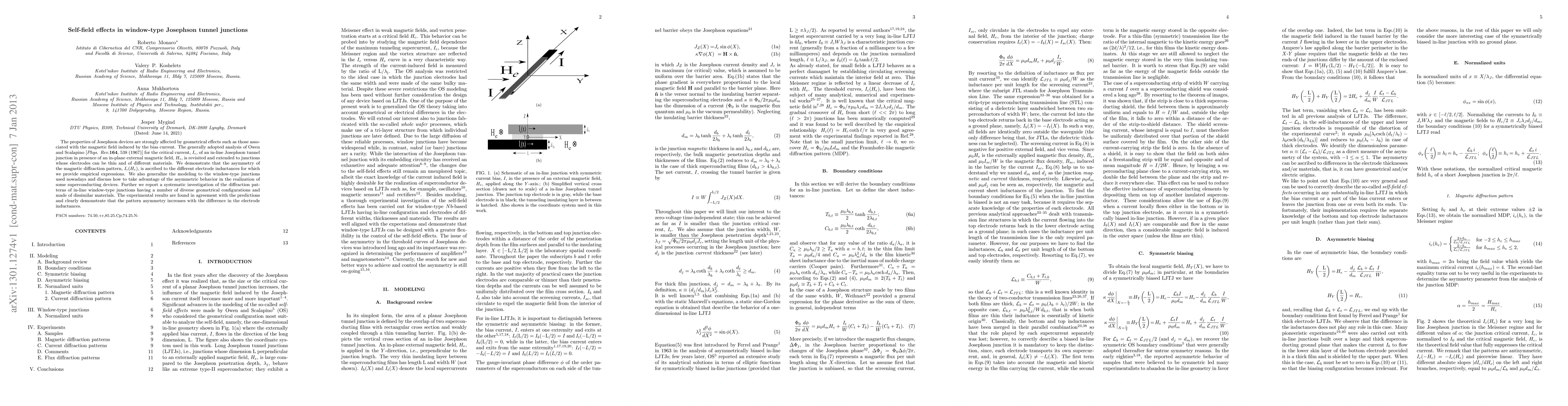 The properties of Josephson devices are strongly affected by geometrical effects such as those associated with the magnetic field induced by the bias current. The generally adopted analysis of Owen and Scalapino [{\it Phys. Rev.}{\bf 164}, 538 (1967)] for the critical current, $I_c$, of an in-line Josephson tunnel junction in presence of an in-plane external magnetic field, $H_e$, is revisited and extended to junctions whose electrodes can be thin and of different materials. We demonstrate that the asymmetry of the magnetic diffraction pattern, $I_c(H_e)$, is ascribed to the different electrode inductances for which we provide empirical expressions. We also generalize the modeling to the window-type junctions used nowadays and discuss how to take advantage of the asymmetric behavior in the realization of some superconducting devices. Further we report a systematic investigation of the diffraction patterns of in-line window-type junctions having a number of diverse geometrical configurations and made of dissimilar materials. The experimental results are found in agreement with the predictions and clearly demonstrate that the pattern asymmetry increases with the difference in the electrode inductances.
