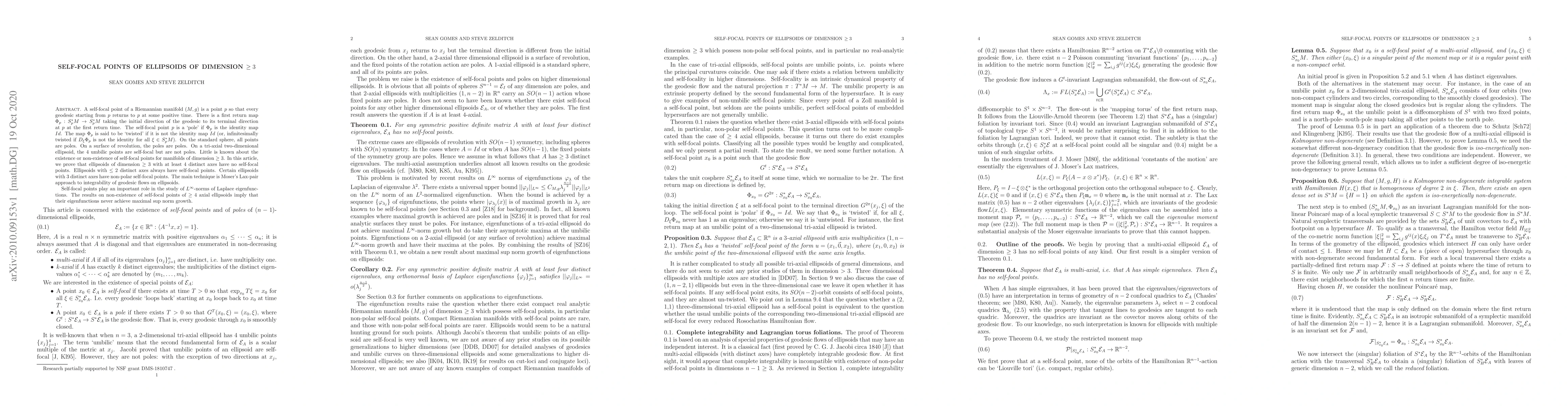 A self-focal point of a Riemannian manifold $(M,g)$ is a point $p$ so that every geodesic starting from $p$ returns to $p$ at some positive time. It is called a pole if all geodesics through $p$ are closed, and a non-polar self-focal point if all geodesics loop back but not all are smoothly closed. Umbilic points of two dimensional tri-axial ellipsoids are non-polar self-focal points. Little is known about existence of self-focal points for Riemannian manifolds of dimension $\geq 3$. We prove that ellipsoids of dimension $\geq 3$ with at least 4 distinct axes have no self-focal points. Certain ellipsoids of dimension $\geq 3$ with three distinct axes do have non-polar self-focal points. Ellipsoids with $\leq 2$ distinct axes always have self-focal points. Self-focal points play an important role in the study of $L^{\infty}$ norms of Laplace eigenfunctions. Our results imply that Laplace eigenfunctions on ellipsoids of dimension $\geq 3$ with at least $4$ distinct axes never achieve maximal sup-norm growth.