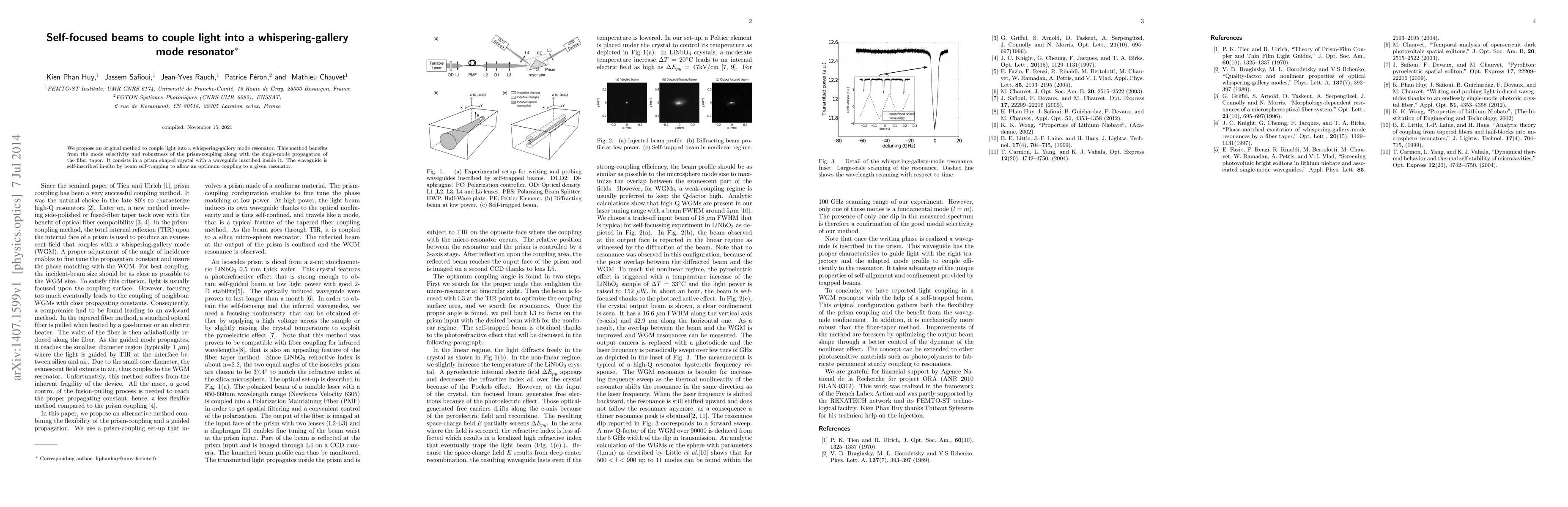 This paper proposes a novel method to efficiently couple light into a whispering-gallery mode resonator using self-focused beams to create an in-situ waveguide within a prism, combining the advantages of prism-coupling and single-mode fiber taper propagation. The self-inscribed waveguide ensures optimal coupling to a specific resonator.