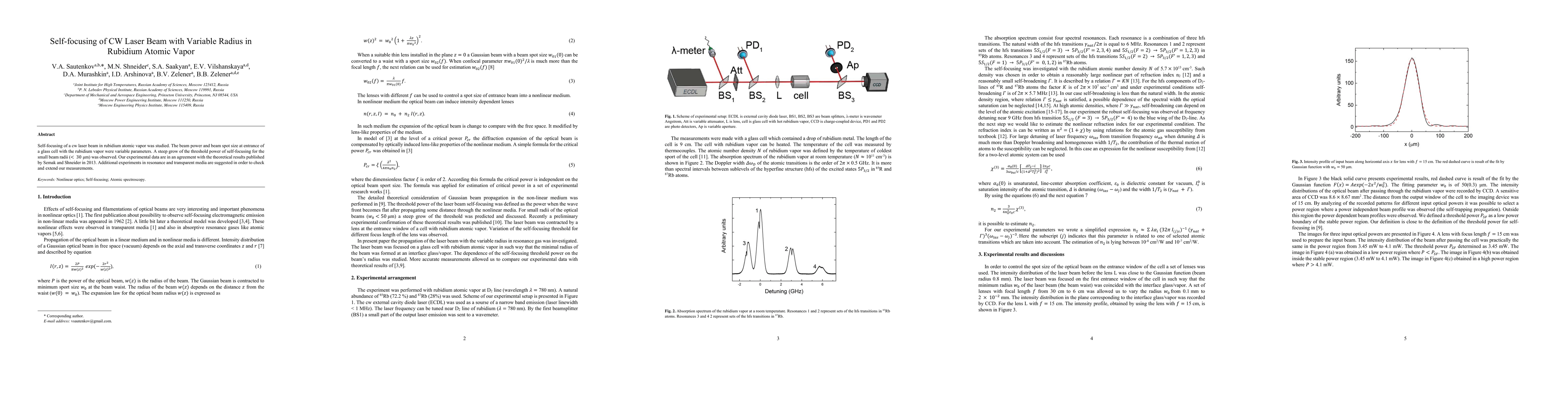 This paper investigates the self-focusing of continuous wave (cw) laser beams in rubidium atomic vapor, finding a steep increase in the threshold power for small beam radii. The results align with theoretical predictions, suggesting further experiments in resonance and transparent media to extend the findings.
