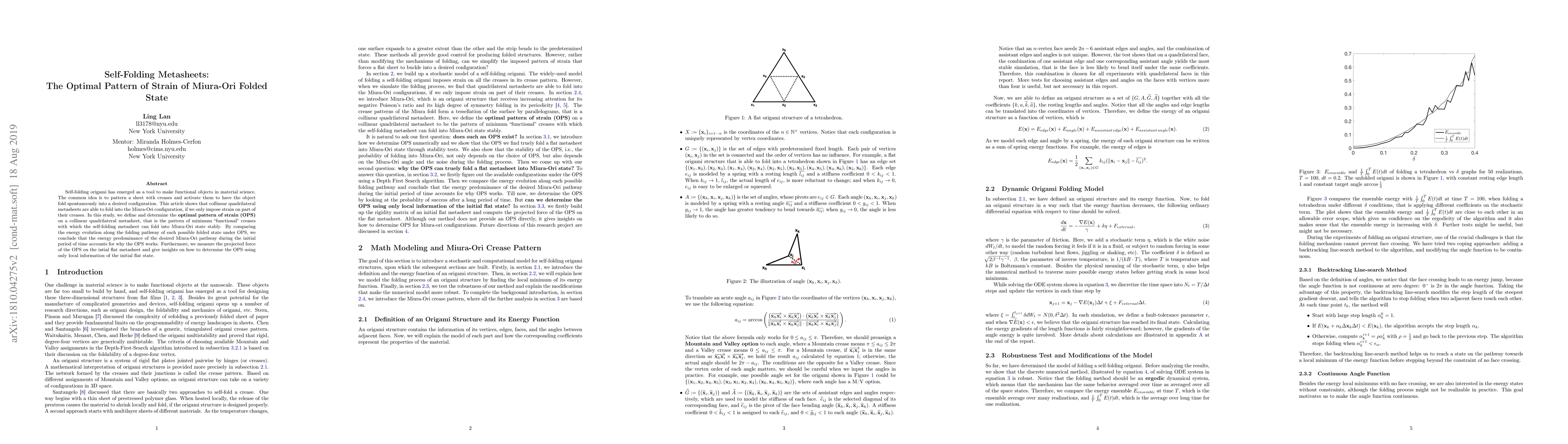 This paper explores the optimal pattern of strain (OPS) for self-folding metasheets to achieve the Miura-Ori configuration by imposing strain only on selected creases. The study finds that the OPS minimizes the number of functional creases needed for stable folding, and the desired pathway's initial energy predominance explains the effectiveness of the OPS.