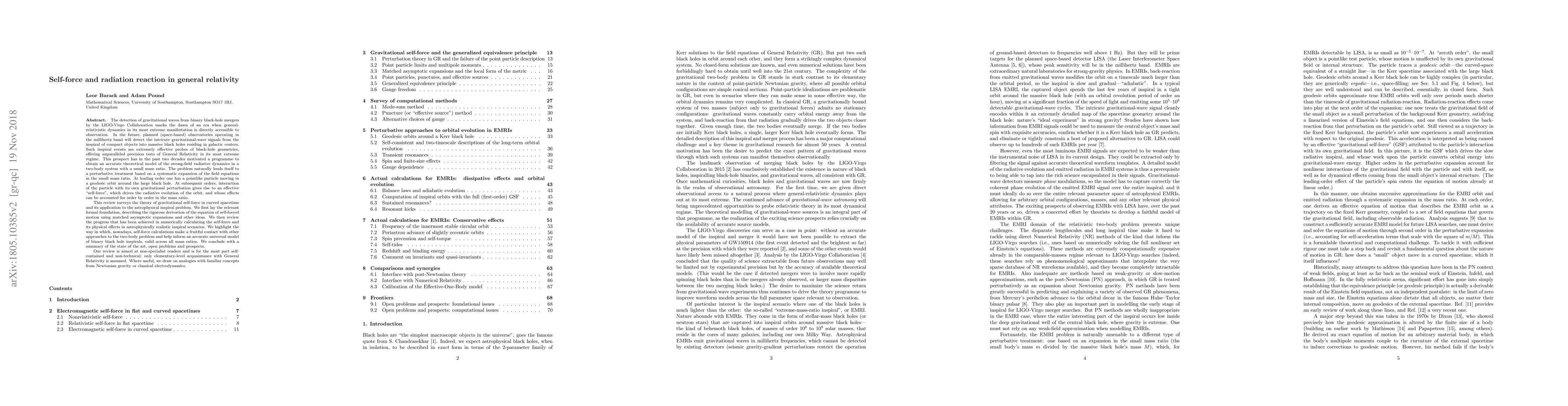 [Abridged] This review surveys the theory of gravitational self-force in curved spacetime and its application to the gravitational two-body problem in the extreme-mass-ratio regime. We first lay the relevant formal foundation, describing the rigorous derivation of the equation of self-forced motion using matched asymptotic expansions and other ideas. We then review the progress that has been achieved in numerically calculating the self-force and its physical effects in the astrophysical scenario of a compact object inspiralling into a (rotating) massive black hole. We highlight the way in which, nowadays, self-force calculations make a fruitful contact with other approaches to the two-body problem and help inform an accurate universal model of binary black hole inspirals, valid across all mass ratios. We conclude with a summary of the state of the art, open problems and prospects. Our review is aimed at non-specialist readers and is for the most part self-contained and non-technical; only elementary-level acquaintance with General Relativity is assumed. Where useful, we draw on analogies with familiar concepts from Newtonian gravity or classical electrodynamics.