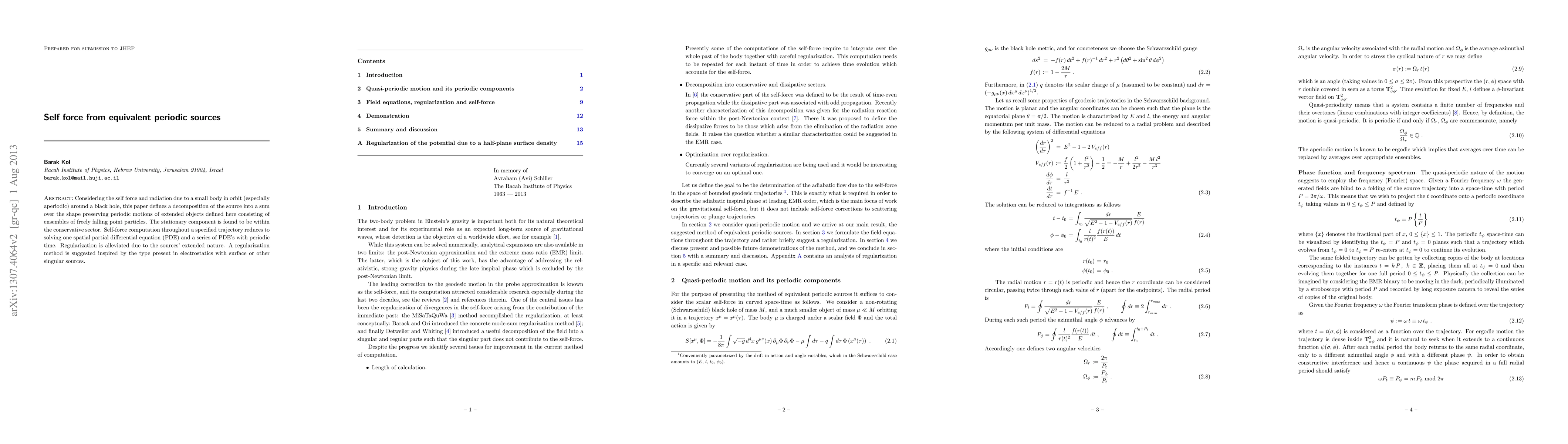 Considering the self force and radiation due to a small body in orbit (especially aperiodic) around a black hole, this paper defines a decomposition of the source into a sum over the shape preserving periodic motions of extended objects defined here consisting of ensembles of freely falling point particles. The stationary component is found to be within the conservative sector. Self-force computation throughout a specified trajectory reduces to solving one spatial partial differential equation (PDE) and a series of PDE's with periodic time. Regularization is alleviated due to the sources' extended nature. A regularization method is suggested inspired by the type present in electrostatics with surface or other singular sources.