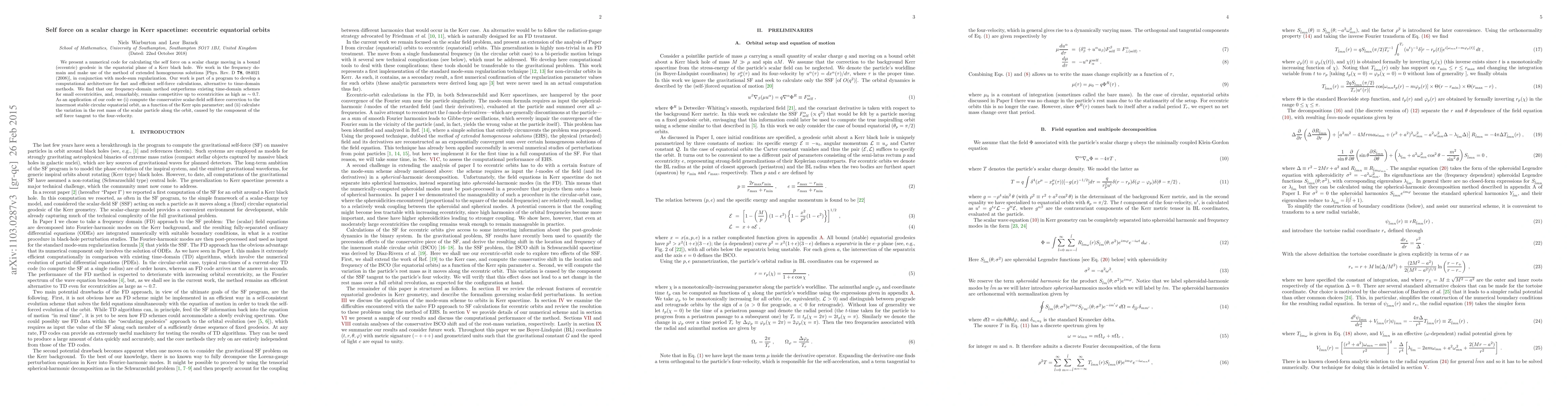 We present a numerical code for calculating the self force on a scalar charge moving in a bound (eccentric) geodesic in the equatorial plane of a Kerr black hole. We work in the frequency domain and make use of the method of extended homogeneous solutions [Phys.\ Rev.\ D {\bf 78}, 084021 (2008)], in conjunction with mode-sum regularization. Our work is part of a program to develop a computational architecture for fast and efficient self-force calculations, alternative to time-domain methods. We find that our frequency-domain method outperforms existing time-domain schemes for small eccentricities, and, remarkably, remains competitive up to eccentricities as high as $\sim 0.7$. As an application of our code we (i) compute the conservative scalar-field self-force correction to the innermost stable circular equatorial orbit, as a function of the Kerr spin parameter; and (ii) calculate the variation in the rest mass of the scalar particle along the orbit, caused by the component of the self force tangent to the four-velocity.