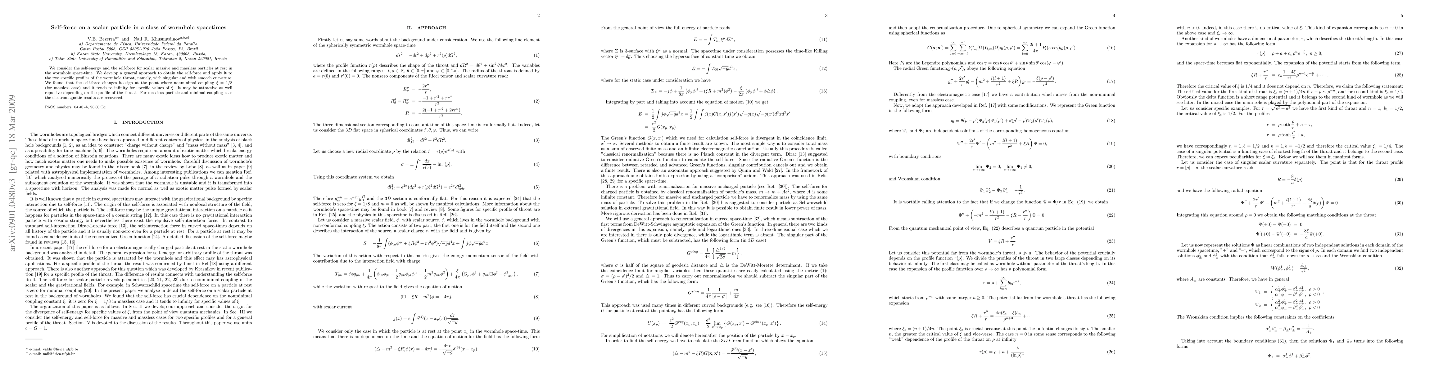 This paper investigates the self-force and self-energy acting on scalar particles in wormhole spacetimes, identifying changes in force sign and infinite tendencies for specific coupling values, with outcomes varying based on wormhole throat profiles. Electromagnetic results for massless particles under minimal coupling are also confirmed.