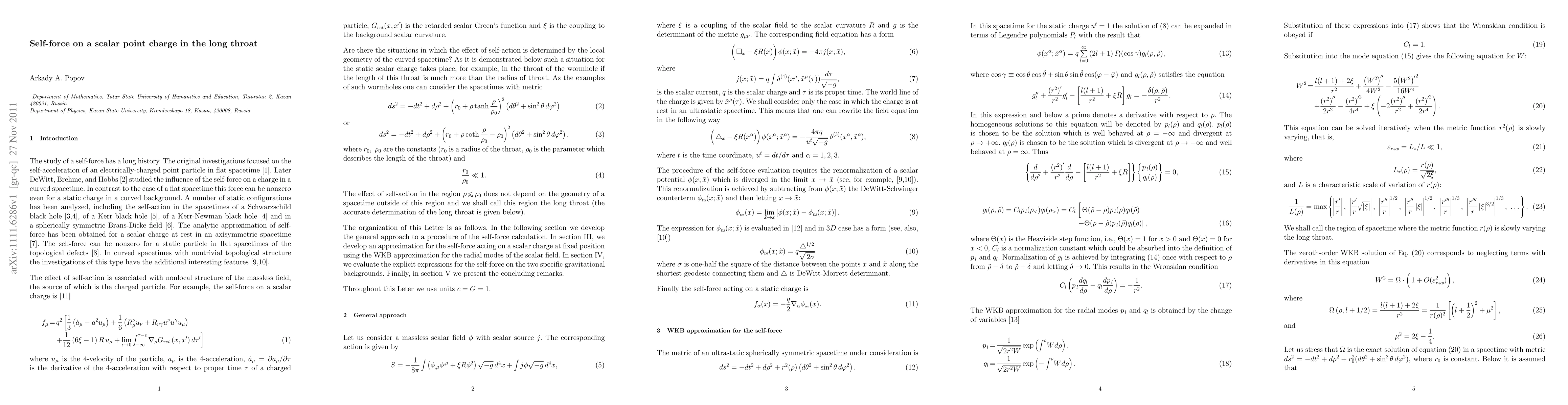 An analytic method is presented which allows for the computation of the self-force for a static particle with a scalar charge in the region of an ultrastatic spacetime which one can call the long throat. The method is based on the approximate WKB solution of a radial mode equation for a scalar field. This field is assumed to be massless, with a coupling $\xi$ to the scalar curvature is satisfying the condition $\xi>1/8$.