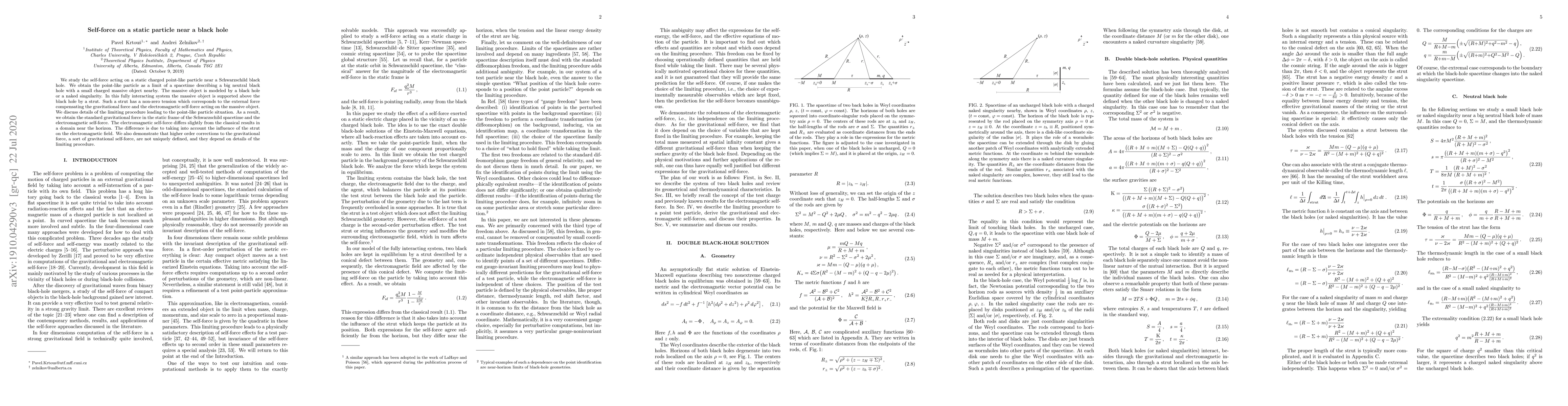 We study the self-force acting on a static charged point-like particle near a Schwarzschild black hole. We obtain the point-like particle as a limit of a spacetime describing a big neutral black hole with a small charged massive object nearby. The massive object is modeled by a black hole or a naked singularity. In this fully interacting system the massive object is supported above the black hole by a strut. Such a strut has a non-zero tension which corresponds to the external force compensating the gravitational force and the electromagnetic self-force acting on the massive object. We discuss details of the limiting procedure leading to the point-like particle situation. As a result, we obtain the standard gravitational force in the static frame of the Schwarzschild spacetime and the electromagnetic self-force. The electromagnetic-self force differs slightly from the classical results in a domain near the horizon. The difference is due to taking into account an influence of the strut on the electromagnetic field. We also demonstrate that higher order corrections to the gravitational force, a sort of the gravitational self-force, are not uniquely defined and they depend on details of the limiting procedure.
