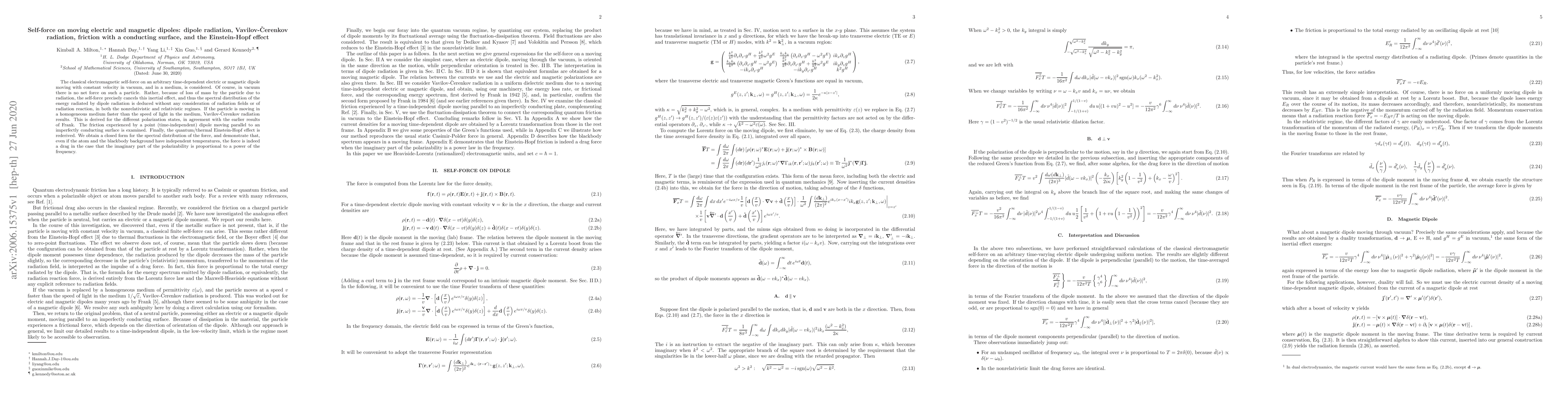 This paper investigates the classical electromagnetic self-force on moving electric and magnetic dipoles, deriving the spectral distribution of dipole radiation and Vavilov-Čerenkov radiation. It also examines the friction experienced by dipoles near a conducting surface and rederives the Einstein-Hopf effect, showing that the force acts as a drag even with differing atom and background temperatures.
