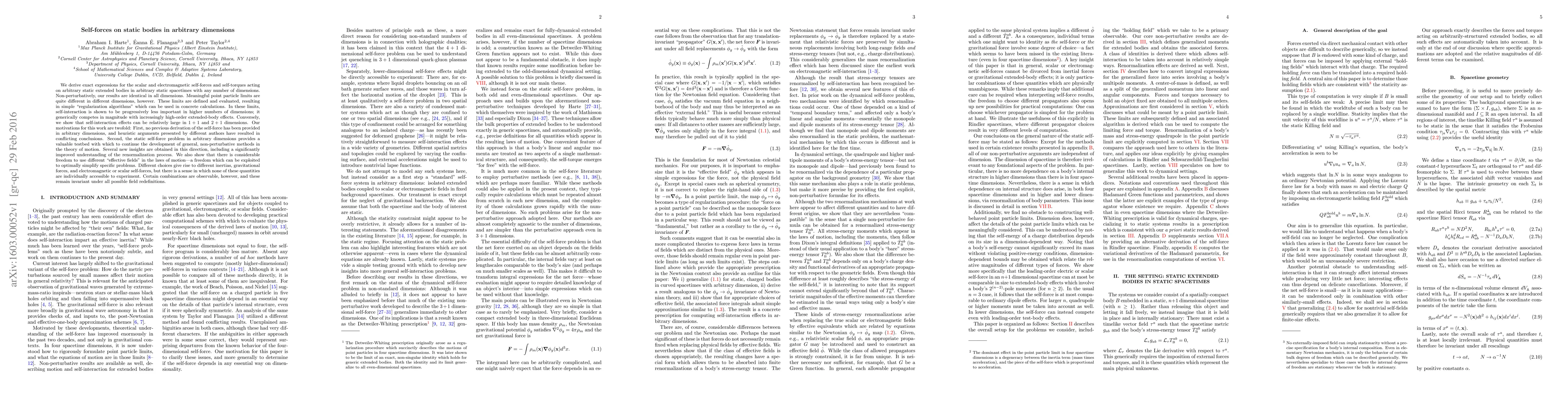 We derive exact expressions for the scalar and electromagnetic self-forces and self-torques acting on arbitrary static extended bodies in arbitrary static spacetimes with any number of dimensions. Non-perturbatively, our results are identical in all dimensions. Meaningful point particle limits are quite different in different dimensions, however. These limits are defined and evaluated, resulting in simple "regularization algorithms" which can be used in concrete calculations. In these limits, self-interaction is shown to be progressively less important in higher numbers of dimensions; it generically competes in magnitude with increasingly high-order extended-body effects. Conversely, we show that self-interaction effects can be relatively large in $1+1$ and $2+1$ dimensions. Our motivations for this work are twofold: First, no previous derivation of the self-force has been provided in arbitrary dimensions, and heuristic arguments presented by different authors have resulted in conflicting conclusions. Second, the static self-force problem in arbitrary dimensions provides a valuable testbed with which to continue the development of general, non-perturbative methods in the theory of motion. Several new insights are obtained in this direction, including a significantly improved understanding of the renormalization process. We also show that there is considerable freedom to use different "effective fields" in the laws of motion---a freedom which can be exploited to optimally simplify specific problems. Different choices give rise to different inertias, gravitational forces, and electromagnetic or scalar self-forces, but there is a sense in which none of these quantities are individually accessible to experiment. Certain combinations are observable, however, and these remain invariant under all possible field redefinitions.