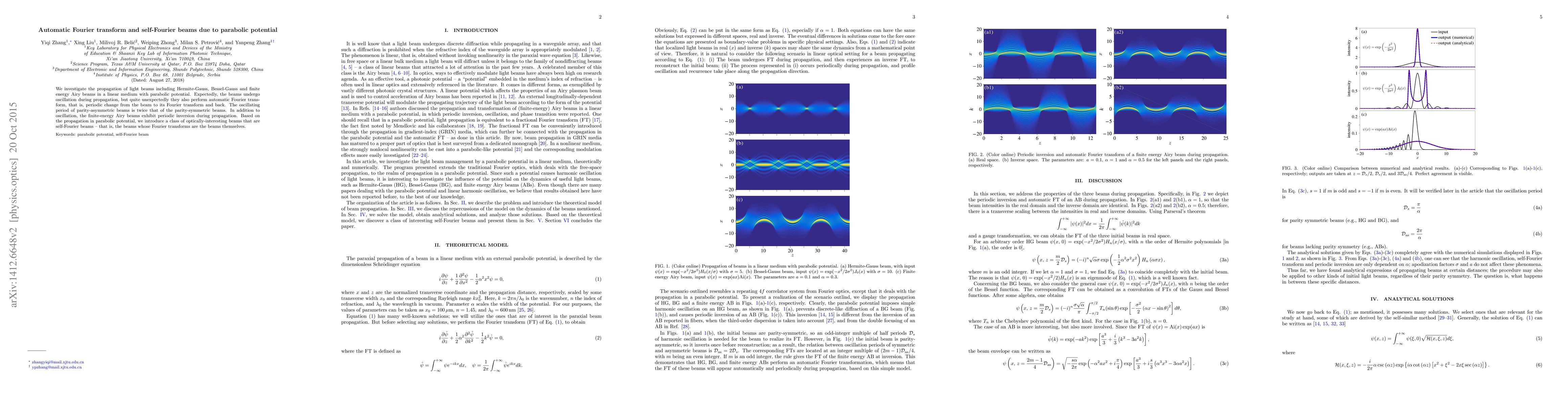 We investigate the propagation of light beams including Hermite-Gauss, Bessel-Gauss and finite energy Airy beams in a linear medium with parabolic potential. Expectedly, the beams undergo oscillation during propagation, but quite unexpectedly they also perform automatic Fourier transform, that is, periodic change from the beam to its Fourier transform and back. The oscillating period of parity-asymmetric beams is twice that of the parity-symmetric beams. In addition to oscillation, the finite-energy Airy beams exhibit periodic inversion during propagation. Based on the propagation in parabolic potential, we introduce a class of optically-interesting beams that are self-Fourier beams -- that is, the beams whose Fourier transforms are the beams themselves.