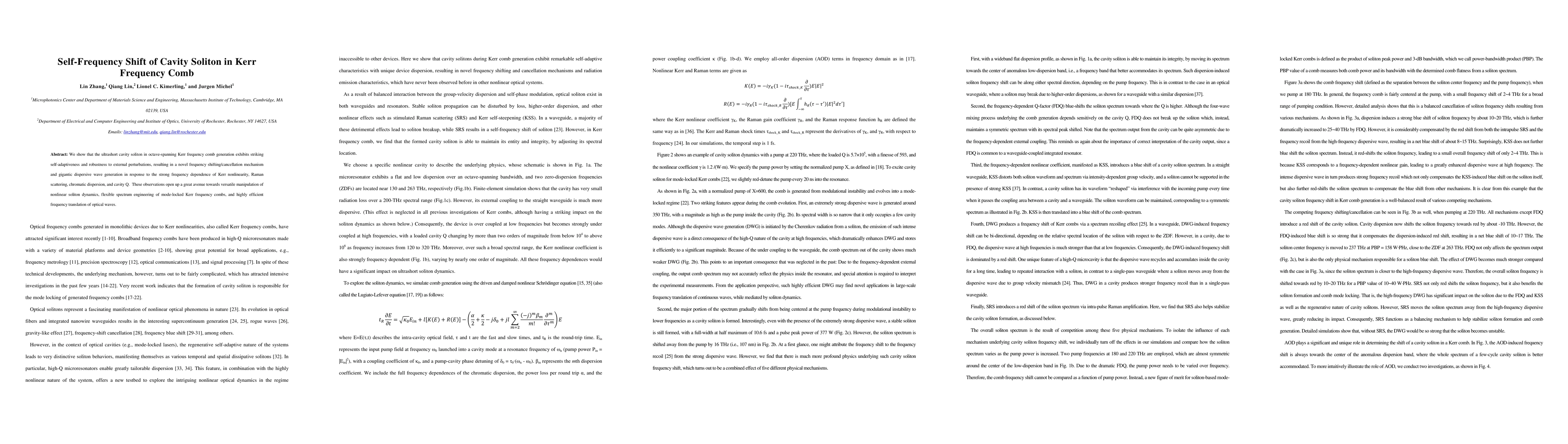 This paper demonstrates the adaptive and robust nature of ultrashort cavity solitons in Kerr frequency combs, revealing a self-frequency shift mechanism that leads to significant dispersive wave generation, which could enable advanced control of nonlinear soliton dynamics and flexible optical frequency translation.
