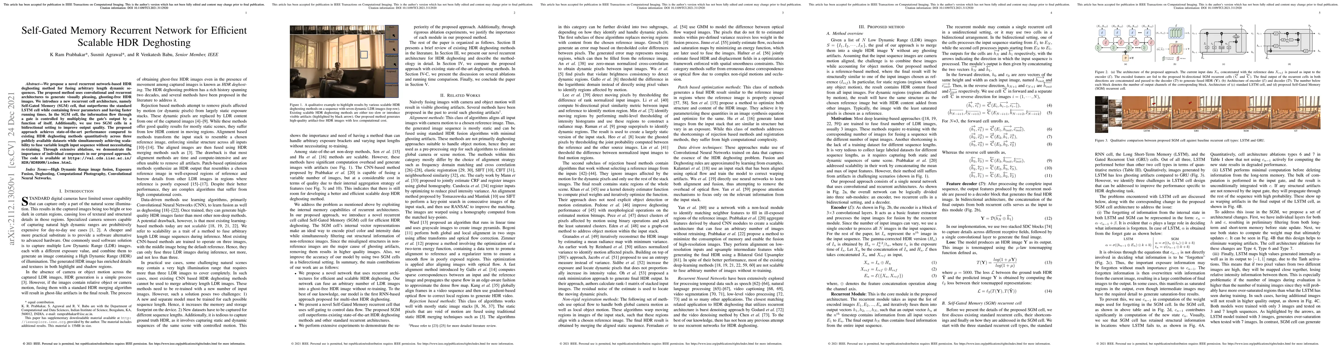 This paper introduces a Self-Gated Memory Recurrent Network for efficient HDR deghosting, utilizing a novel SGM cell that outperforms LSTM with fewer parameters and faster processing. The method fuses dynamic sequences using convolutional and recurrent architectures, achieving state-of-the-art performance across multiple datasets.